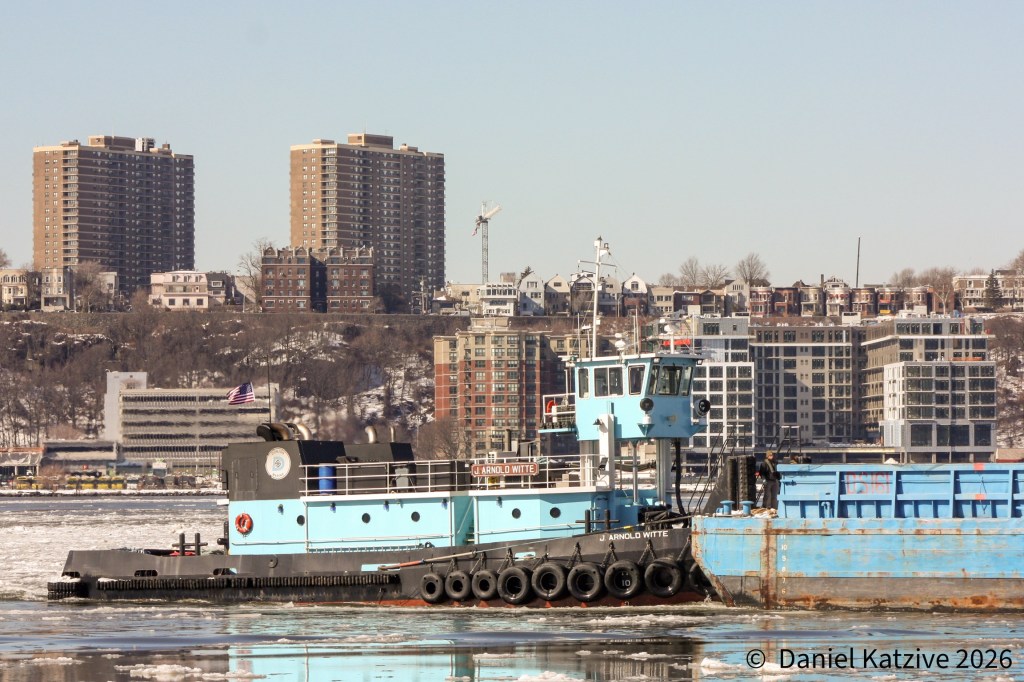 Returning to New York City from warmer climes finds the harbor beset by the heaviest icing conditions seen in decades and new ways of operating on the North River already becoming routine. NY Waterway has contracted with Stasinos Marine to help keep their trans-Hudson routes operating and Sunday morning finds the 71-year-old tug Joanne Marie, who is normally based in Fall River, Mass, escorting the ferry Garden Sate between Pier 79 and Port Imperial. Built in 1954 for the U.S. Army, Joanne Marie was acquired by Stasinos in 2022 and is I believe now the oldest tug doing regular commercial work in New York Harbor. Long may you run!
