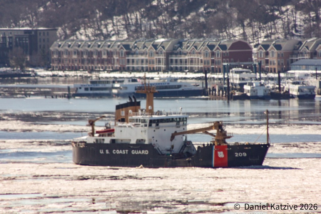The Coast Guard cutter Hawser was breaking ice between North River Pier 99 and Pier i early Monday morning as temperatures hovered around 11 farenheit. This section of the estuary generally remains navigable without human intervention, with the steady barge traffic and ebb and flow of the tide sufficient to keep the channel clear, but this is an exceptional winter. The 65-foot small harbor tug is the only Coast Guard icebreaker working New York Harbor this morning I believe, with both of the local 140-footers busy up north (Penobscot Bay is working north from Poughkeepsie and Sturgeon Bay is off Newburgh) and the other 65-footers Wire and Line and the buoy keeper Katherine Walker not showing up on AIS. After making a loop as far north as West 72nd Street, Hawser spent some time around the Manhattan Cruise Terminal where Norwegian Breakaway arrived this morning and then headed for the Upper Bay.