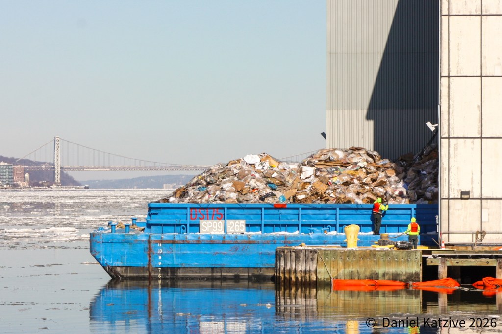 The NYC DEP sludge tanker Port Richmond made a hard turn into the flood tide on Monday morning in order to dock port side to the North River water treatment plant. The tanker loaded a cargo of sludge and brought it to the Passaic Valley Water Commission plant in Newark for dewatering. The PVWC processes a portion of NYC’s residual solid waste, with the balance going to centrifuges at the Wards Island plant and a few other locations.