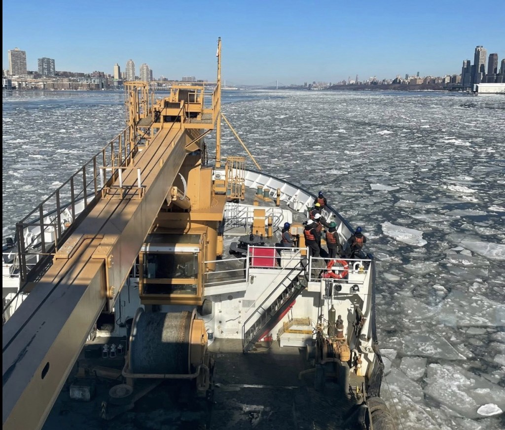 Army Corps of Engineers vessel Hayward collected a hazard to navigation from the icy North River on Monday, perhaps a piece of dock which broke up in the ice further north. For historical reasons which date back to the 19th Century, while the Coast Guard is responsible for keeping navigable waterways clear of ice, removing other obstructions falls to the civilian employees of the Army Engineers.