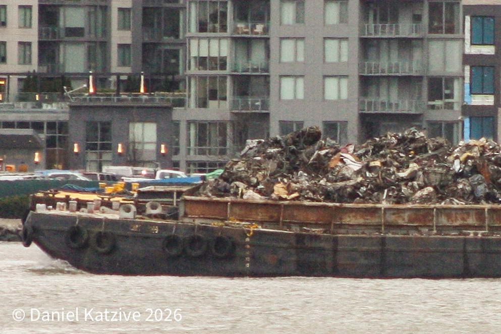 For as long I can remember, New York Sanitation Department barges hauling waste paper away from North River Pier 99 have been painted blue, in a slightly darker shade than the livery of the DonJon Marine tugs which haul them under contract to the recycling mill on the Staten Island shore of the Arthur Kill. But on Friday, DonJon’s Paul Andrew brought a green painted barge up to the pier and, rather than being stamped with DSNY as the blue ones always had been, this barge bore the logo of Pratt Industries, which runs the recycling mill. Will this become the new normal?