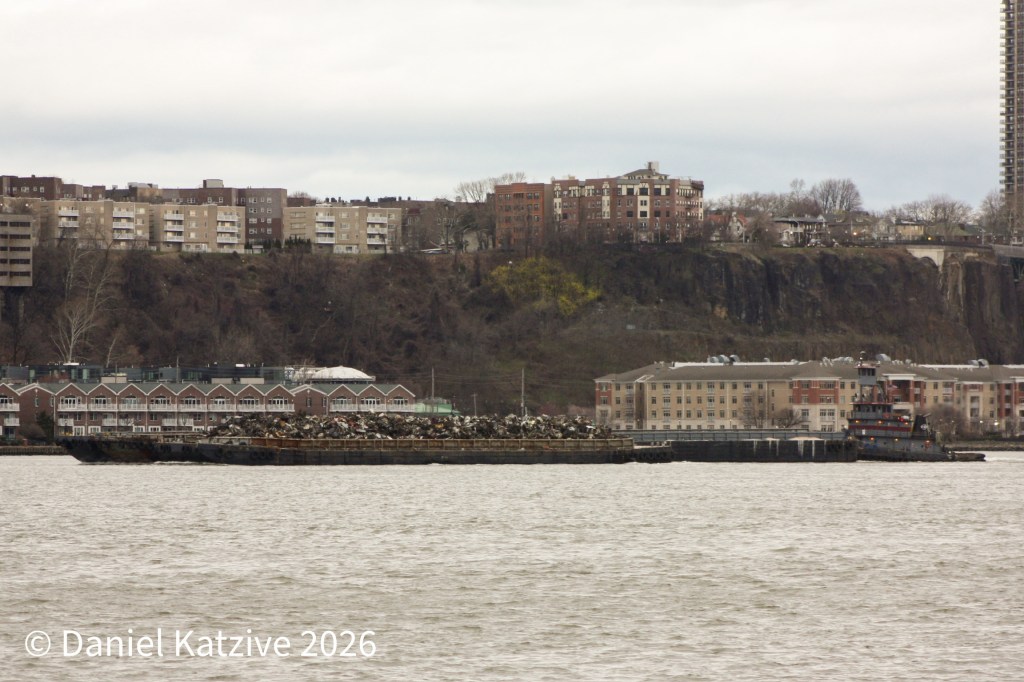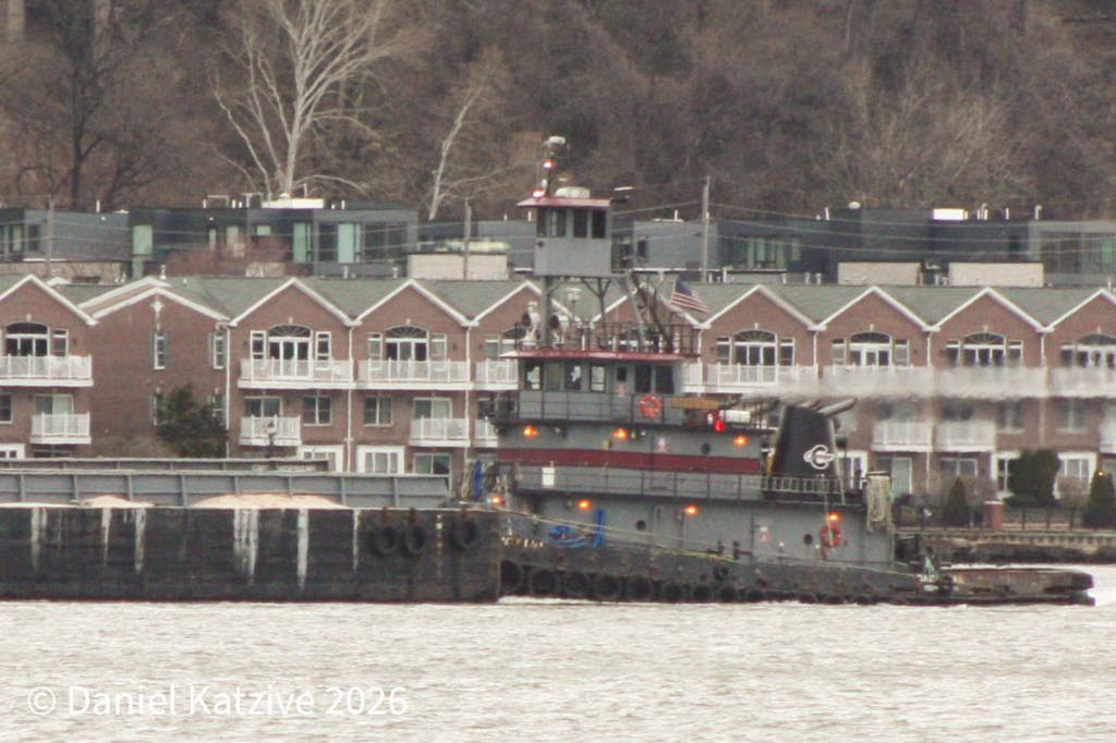The Kirby Mount St. Elias/DBL 82 ATB has been a regular on the Hudson River routes this winter. On Friday morning, the unit passed West New York, New Jersey on her way down the North River. The accurately if unimaginatively named town sits between Weehawken and Guttenberg, NJ and lettering at the top of the Palisades cliff identifying this little stretch of the riverbank is visible to the left of the elevated wheelhouse on the tug in the photo.