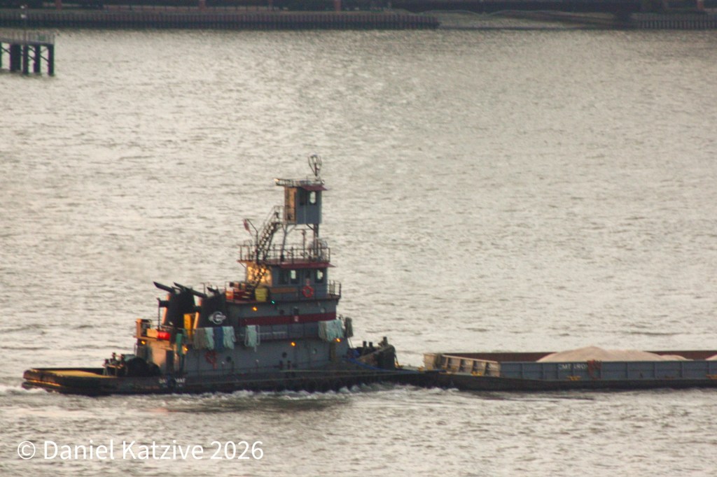 Reinauer’s Dylan Cooper/ RTC 108 ATB, a 4,000 HP tug paired with a 108,000 barrel capacity barge, spent Tuesday at anchor on the North River off West New York after arriving after dark Monday evening. At slack tide, a launch called Grace D paid a visit and spent some time alongside. After sundown, Dylan headed back down to the Upper Bay where she remains at anchor off Erie Basin.