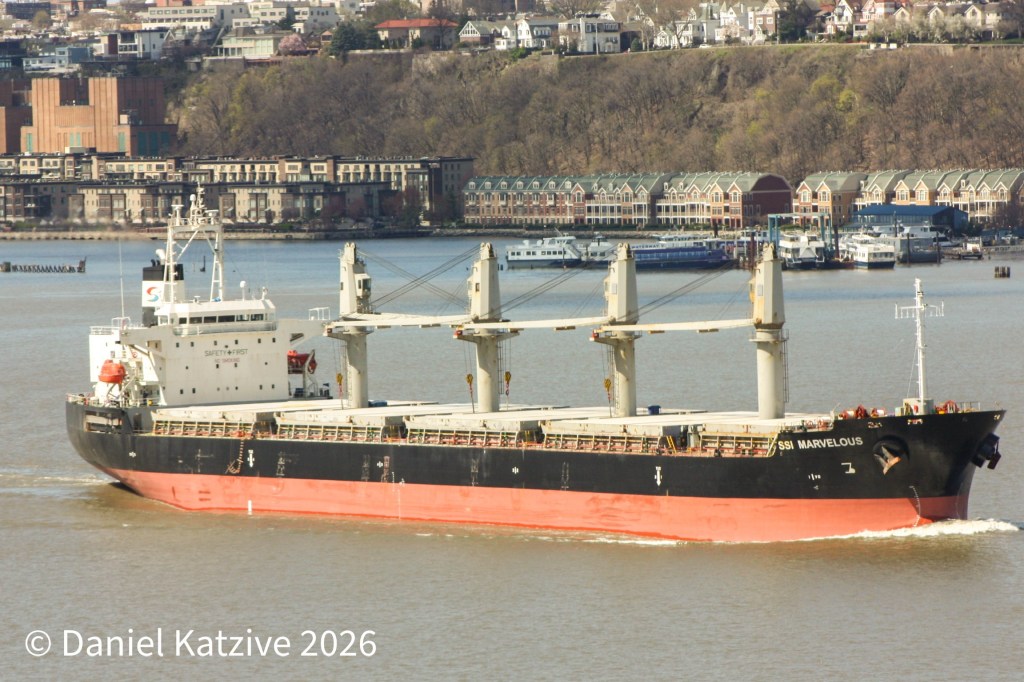The bulk ship SSI Marvelous came up the North River Monday morning, the first of two bulkers to pass through within a half hour of each other. Unlike most of the bulk ships we see this time of year which are bringing salt to the Port of Coeymans, Marvelous was carrying cement and heading for the Cementon pier in the Town of Catskill after first calling to partially discharge in Providence.