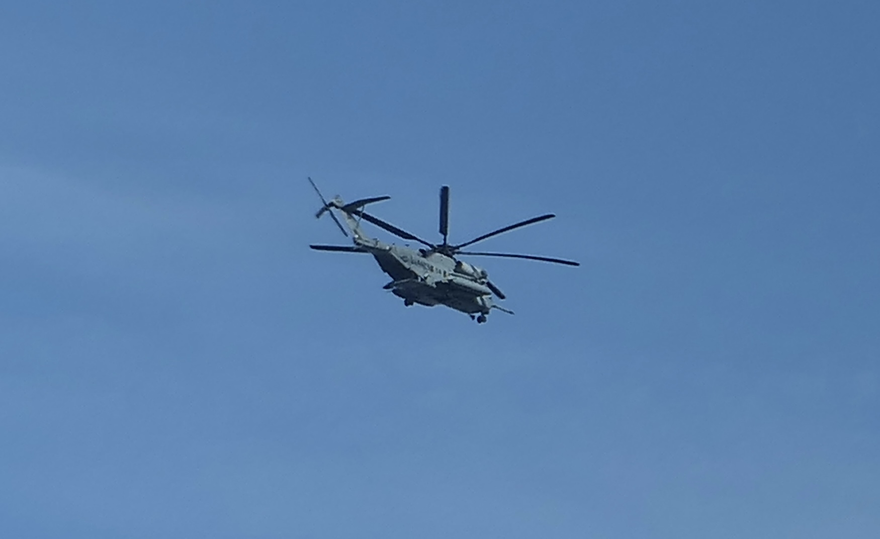 Military aircraft use the Hudson as a kind of sky highway for moving north at low altitudes. On Sunday, this Marine King Stallion flew past NYC at 300 feet. The chopper originated at McGuire Airforce Base in Lakehurst NJ which hosts a Marine reserve aviation logistics unit, and flew up the river into Dutchess County, made a loop around Anthony’s Nose and came back. A 1.5 hour training mission I assume, and a beautiful day for it.