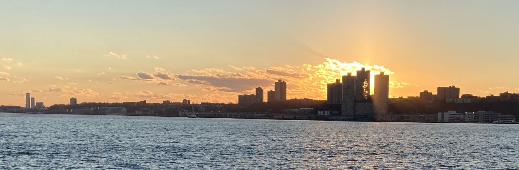 The photo below shows the sun setting behind the Galaxy Apartments in Guttenberg New Jersey. The three Galaxy buildings went up in 1976, among the earliest towers built on that side of the river. The main entrances to the towers are on top of the Palisades cliffs, but the bases continue down to river level. River Road in Guttenberg now is developed with low rise condominiums, but back in 1976 this was a post-industrial wasteland, marked by railroad tracks and oil storage tanks. You can look on historicaerials.com and see a 1979 aerial view of what this looked like back then: https://www.historicaerials.com/location/40.78881932928867/-73.99884862004093/1966/17