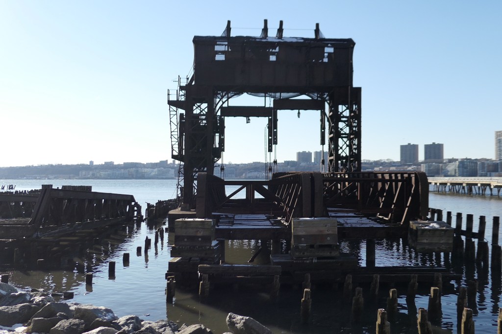 The purpose of the transfer bridge was to allow freight cars to be rolled from tracks on land and onto barges. The barges could then be floated across the river to the New Jersey side where a similar mechanism existed to deliver the cars into the New York Central (West Shore Railroad) yards in Weehawken. From there, the cars could move inland through a tunnel in the Palisades which still exists and is used by New Jersey Transit’s Hudson-Bergen Light Rail or they could move along the river to other railroad yards on the Jersey shoreline.