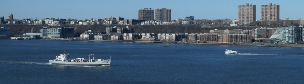 The DEP’s North River tanker was servicing the North River sewage plant, hauling away residual solids (sludge) for dewatering at the Wards Island plant. The NY Waterway Edgewater ferry passes heading south. NY Waterway runs rush hour weekday to Edgewater Landing. A similar service used to run from an area just south of there to a dock at 125th Street until the 1960s.