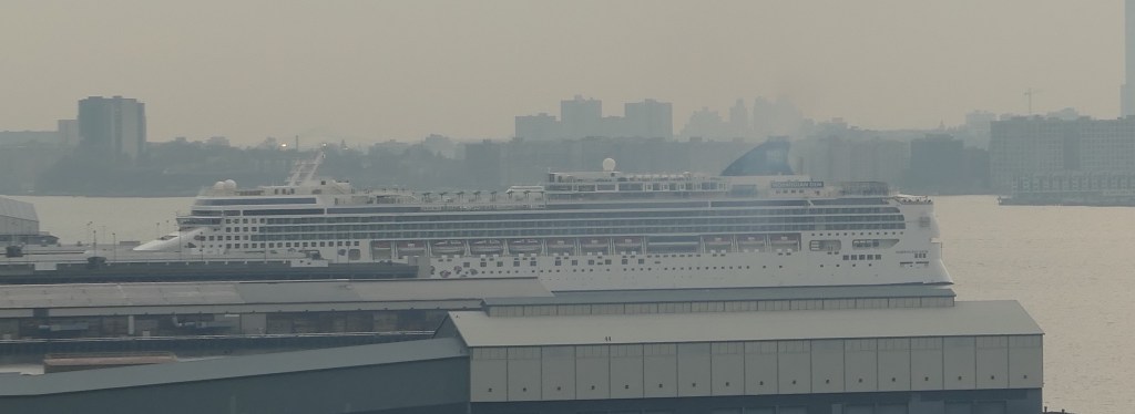 Clearer skies and warmer weather arrived Thursday, and so did Norwegian Gem, returning from the Caribbean. A Vane Brothers tug arrived with a fuel barge for bunkering, and then the Gem was on her way again by sundown, heading back towards San Juan.