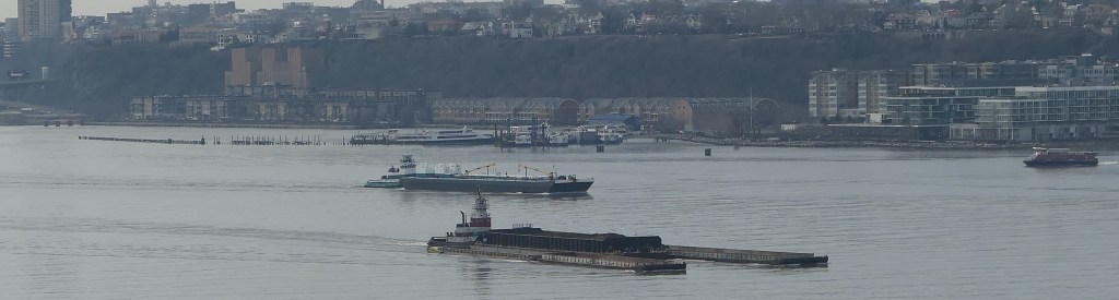 Mackenzie Rose which, like Mister Jim, is owned by the Port of Coeymans (Coeymans Marine Towing), was on the way back home pushing a number of barges against the ebb tide, one of which appeared to be loaded with dirt or excavated fill. She was overtaken by Kimberly Polling returning from New Haven with an empty barge. The Kimberly would go on to anchor further up the river, a bit north of the Teresa. A Waterway ferry leaving Port Imperial maneuvered to pass behind the barges.