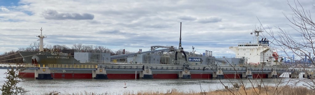 A short trip away from the North River found the Panama-flagged NACC New Yorker unloading cement at the McInnis Cement depot in Oak Point in the Bronx, on the northeastern end of the East River before it becomes Long Island Sound. McInnis manufactures cement at a plant on the end of the Gaspe Peninsula in Quebec, near limestone quarries it also owns there. The cement is brought to US ports for distribution in foreign flagged vessels like this one, which are not typically seen on the North River. In contrast, Lafarge Cement manufactures from a large plant up the Hudson in Ravenna, New York, and sends the product to market in New York City on Jones Act compliant U.S. flagged barges and tugs provided by Dann Marine. Those barges can frequently be seen passing through.