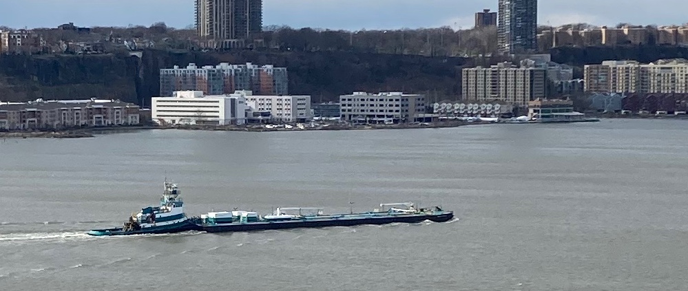 Brisk west winds brought occasional rain squalls but mostly sunny skies on Saturday. Sewage does not pause for the weekend unfortunately, and the DEP’s Red Hook continued its appointed rounds servicing the North River plant and ferrying sludge to the Hunts Point plant for dewatering. The structure visible above the middle of the tanker is the Weehawken Water Tower built in 1883 (see https://www.brownstoner.com/upstate/weehawken-water-tower-new-jersey-hackensack-water-company/).