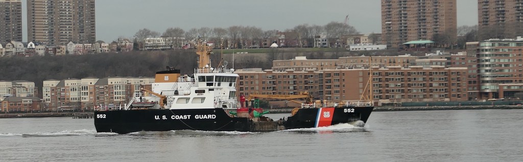 Earlier in the day, the Coast Guard’s Katherine Walker, a buoy tender, headed north, with red and green buoys visible on her deck. By the end of the day she had reached the Bear Mountain Bridge. Somewhere along the way, she will have passed the Coast Guard 65’ harbor tug Line, which is based up in Saugerties New York and came south to the Bayonne Coast Guard Station.