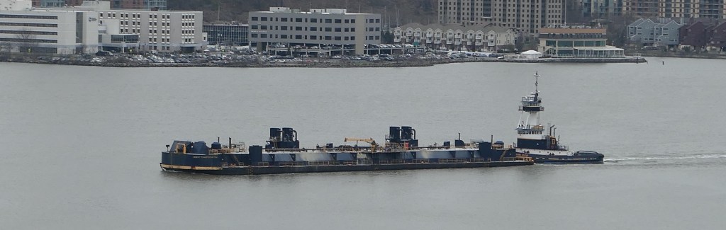 Lots of activity on the river Tuesday as winds calmed and temperatures were at least stable. The tug Teresa, which has been anchored with its barge in the river for several months now amid operational/legal complications, made a morning departure, uncoupling from its barge and heading down to a fuel dock on the Arthur Kill for most of the day. The barge was left alone in the river, anchored but with no tug boat. This is unusual to say the least and the first time I have ever seen this, though the moves were presumably sanctioned by the Coast Guard. By late afternoon, the Teresa had returned to its charge. Teresa was shadowed by a pilot boat on its return. These do not usually come up the North River and it briefly came alongside after the Teresa had rejoined the barge, suggesting a pilot may have assisted in that procedure, though why that would be the case is not clear. As usual with Teresa, there are more questions than answers.