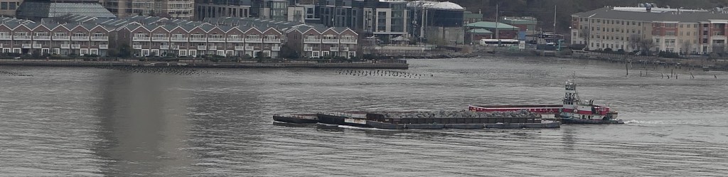 Dann Marine’s Treasure Coast came through pushing a cement barge from the Lafarge plant up in Ravenna and heading for the Lafarge depot in Brooklyn. Mr. Jim came down from Coeymans with several barges, including one loaded with large rocks.
