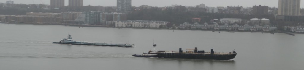 A low pressure system has camped out over New York, sucking in moisture and rain for a second day. There was a bit of northbound traffic worth noting in the morning. The Janice Ann Reinauer came through with a loaded barge from Bayonne heading to Newburgh.