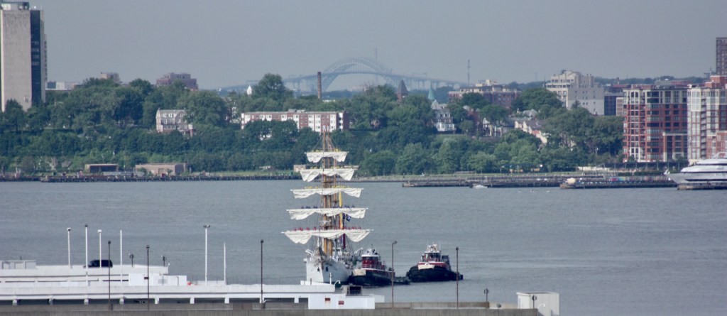 The Colombian Navy ship ARC Gloria, a three-masted sailing barque commissioned in 1968, arrived at Pier 86 this morning. The ship is a training vessel and the official flagship of the Colombian Navy. Gloria is here in part to commemorate the 200-year anniversary of US-Colombian diplomatic relations. For more on her voyage, see this article in Spanish.