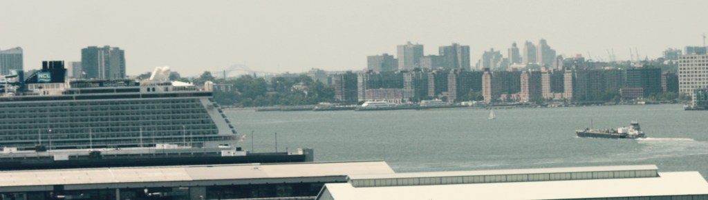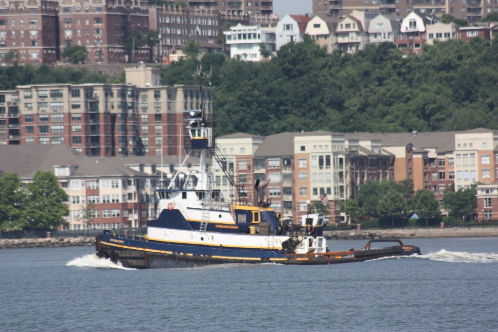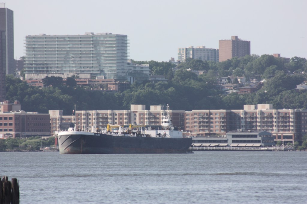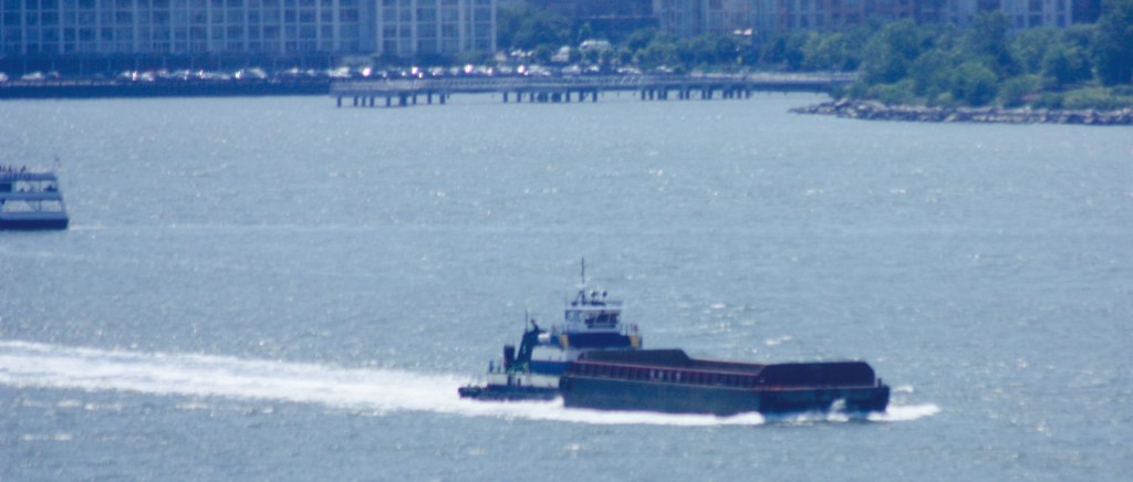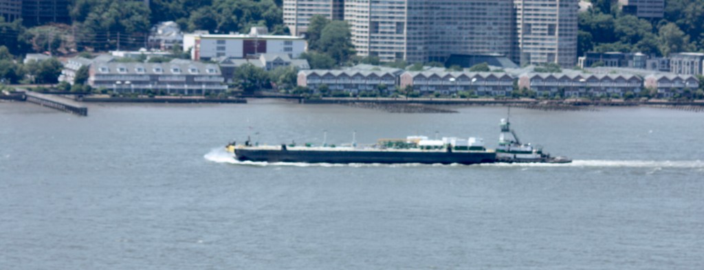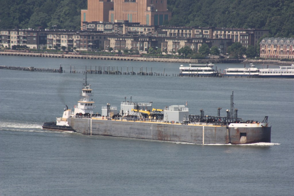 The tug Rhea Bouchard anchored off 72nd Street with an empty barge. The Bouchard Towing Company is out of business and the tug is owned under new ownership but apparently retains this name.