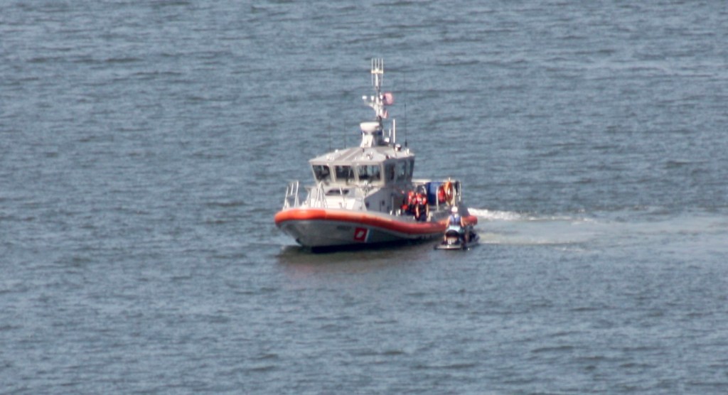 A Coast Guard 45’ response boat stopped a small yacht and 3 Coasties boarded for about 15 minutes, likely for a safety inspection. They later spent some time alongside a jet skier.