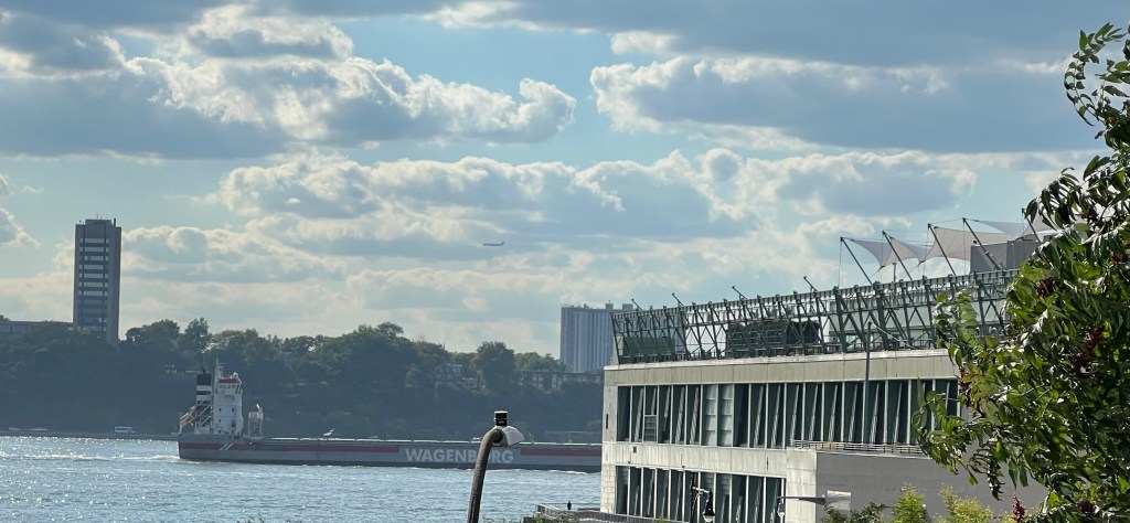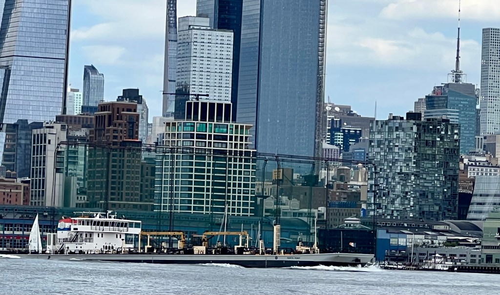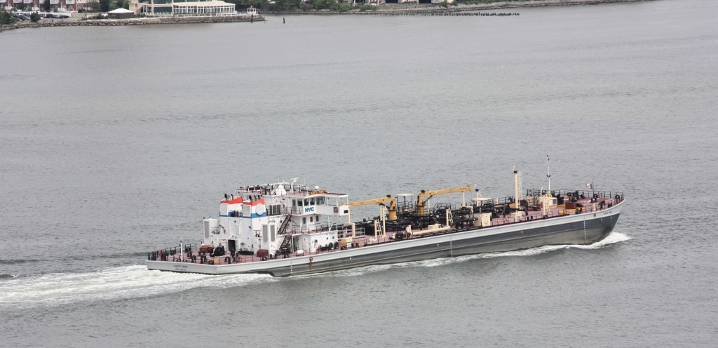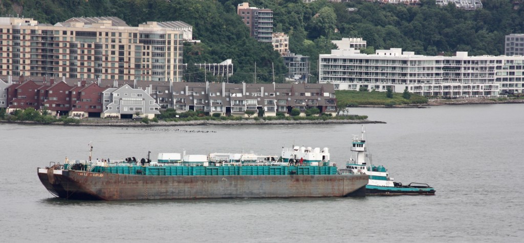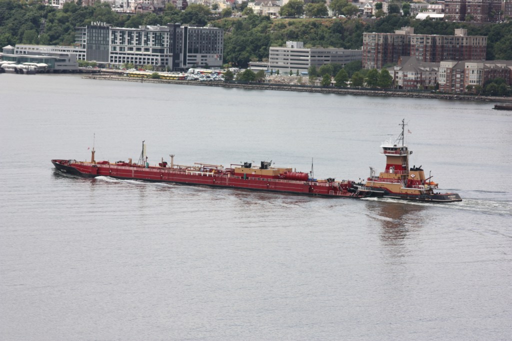 The heat wave broke somewhat on Wednesday, with temperatures dropping down into the 80s, though winds also dropped off. Traffic was fairly light. The Saint Emilion arrived from Albany with an empty tanker overnight and dropped anchor off 96th Street. She was joined later by Kristin Poling, arriving with a light barge after a delivery in New Haven and then heading back to the Arthur Kill in the afternoon. The Dean Reinauer came through pushing a loaded barge down from Albany and signaling Portland, Maine. Usually loaded barges move north on the River, but we saw a similar move heading for Boston last month, and these could be ethanol cargos transported to Albany by rail and then on to New England by barge.