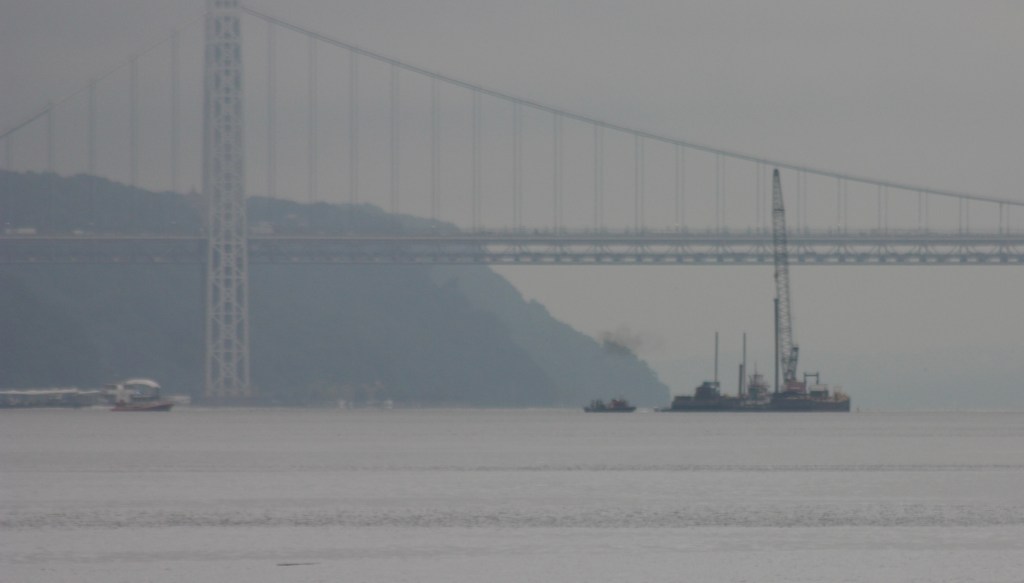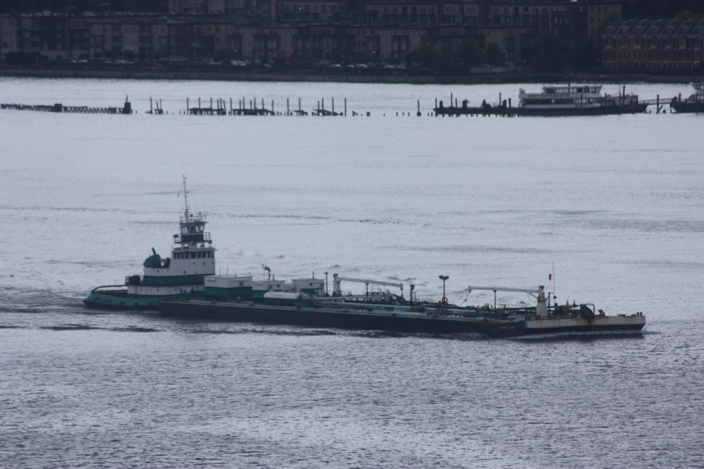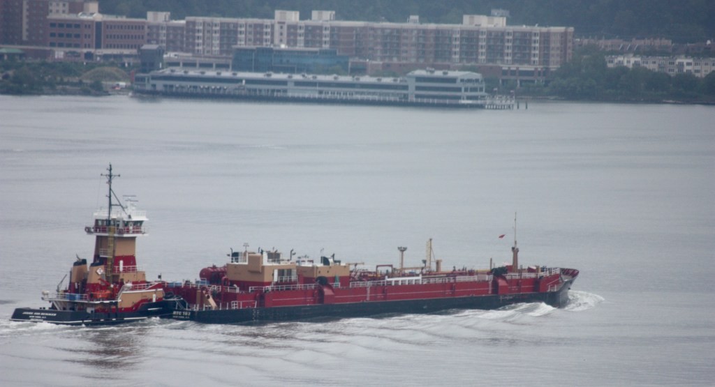 Monday brought moderate temperatures and periodic thunderstorms passing through, with more on the way in the evening. Tanker traffic remained fairly heavy on the River. Meanwhile, in reporting for West Side Rag, we learned Ken’s Marine has been retained by the insurance company of the 48’ yacht which sank in the River on Saturday to salvage the vessel off the bottom. A deck barge and tug were over the location this morning, along with a 45’ Coast Guard boat, though the weather systems passing through may have interfered with their work. See the West Side Rag article for more.