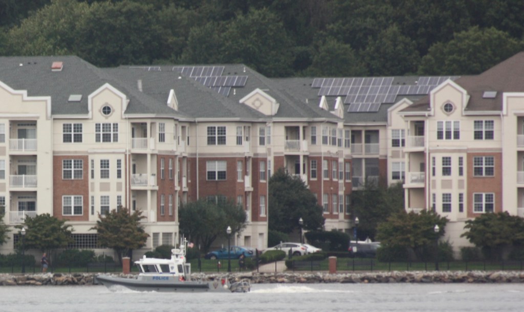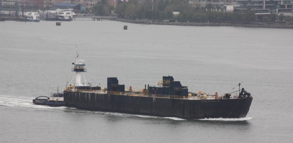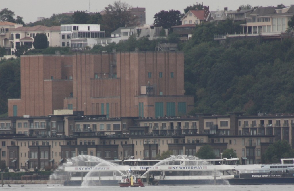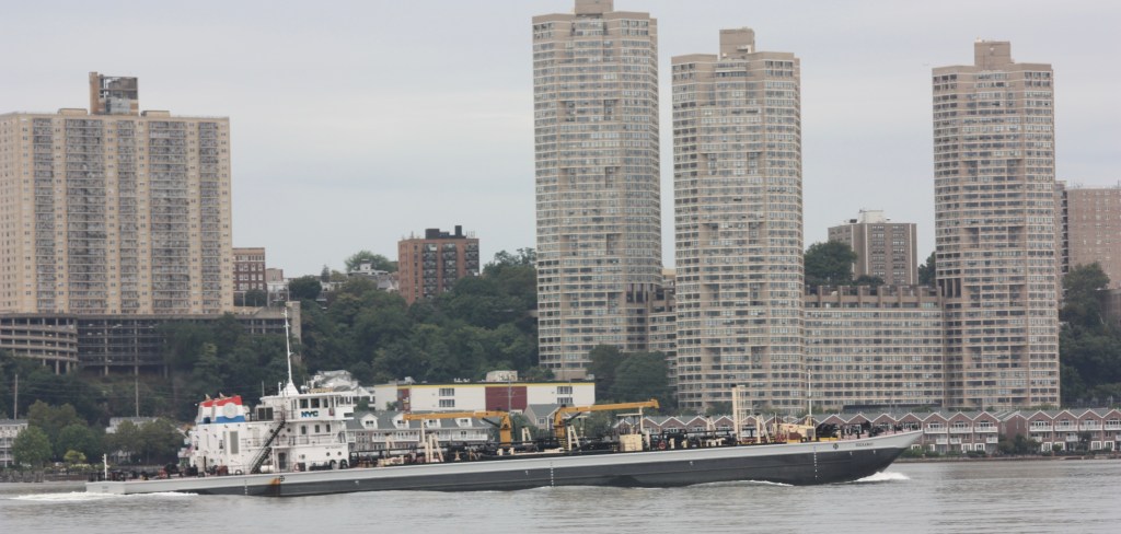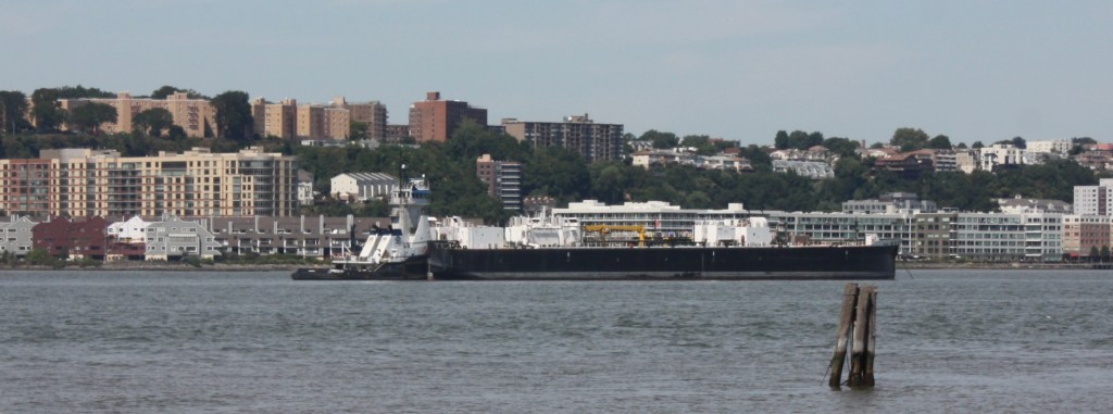 A stone hopper being brought back north empty on FridayAn American Petroleum tug pushing a tanker barge north towards AlbanyKirby’s Lincoln Sea was anchored off 79th Street for the weekendBuchanan12 passed the Lincoln Sea with a load of crushed dolomite heading for Jersey CityThings got tight as a Norwegian cruuse ship left Pier 88 as B12 was moving south, and dredge scows looked onThe DEP’s Rockaway was servicing the North River plant SundayA Port Authority Police boat headed south Sunday, perhaps for 9/11 ceremoniesNorth Hudson’s marine unit was exercising its water canons, perhaps rehearsing for the ceremoniesA Yonkers police boat passed Dyckman Street Marina on its way, presumably also an attendant at commemorations downtownDann Marine brought an empty cement barge north for refilling at the Lafarge plant upstate Sunday morningSunday evening, colleagues were bringing a loaded cement barge in the opposite direction, passing Buchanan12 on two whistles in the fading lightA C130 flying south down the river Sunday morningThis unusual yacht was anchored off Englewood Cliffs, perhaps a fishing vessel retrofitted for yacht dutyThis ketch was anchored north of the North River sewage plantA more conventional super yacht was anchored of Englewood Marina, with the marina’s large flag flying at half staff