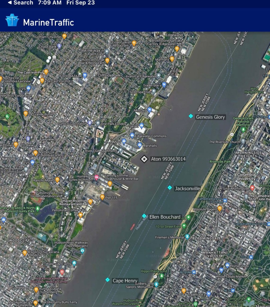Friday morning saw an unusually large gathering of anchored tugs in the North River, with Cape Henry, Ellen Bouchard, Jacksonville, and Genesis Glory all swinging on their chains. There was no obvious reason for this glut of tanker capacity, though perhaps strong winds overnight were a factor(?) In any event, by the end of the day, only Cape Henry and Ellen remained, though they were also joined by the Coast Guard cutter Sturgeon Bay, which resumed its UN week security post off 96th Street after a day tied up by the Intrepid.