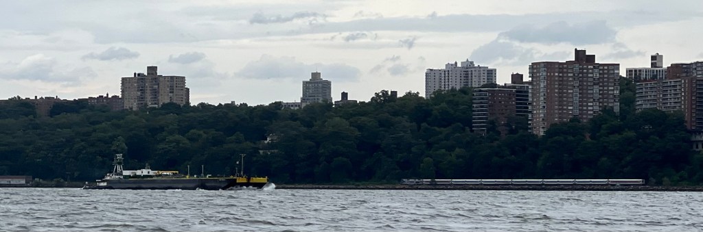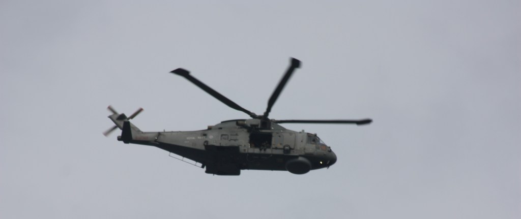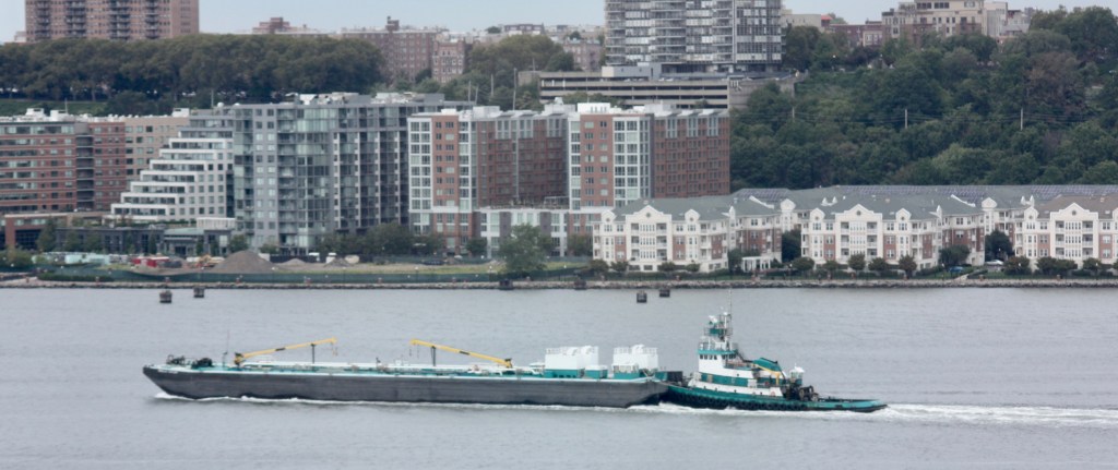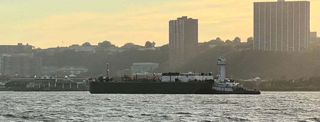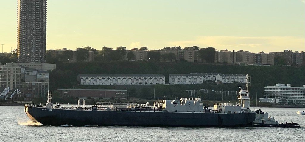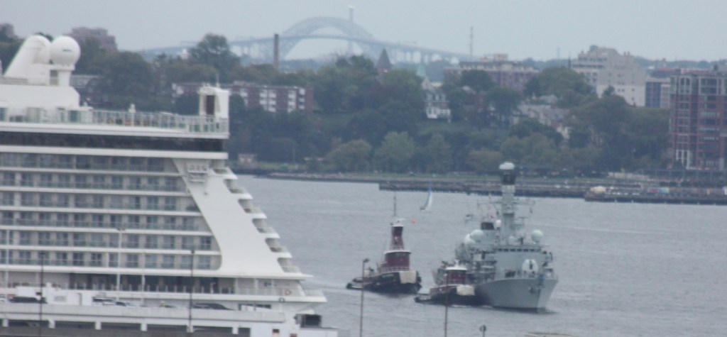 The Royal Navy arrived in New York Harbor Sunday, with the flagship aircraft carrier HMS Queen Elizabeth steaming in to host an Atlantic Future Forum on board. The carrier was accompanied by the frigate HMS Richmond, which came up the North River to dock at Pier 88 as the carrier anchored in the Upper Bay. A carrier based Merlin HM2 helicopter flew up the North River ahead of the Queen’s arrival and made several loops up the River during the day. Meanwhile, tanker traffic on the River was heavy.