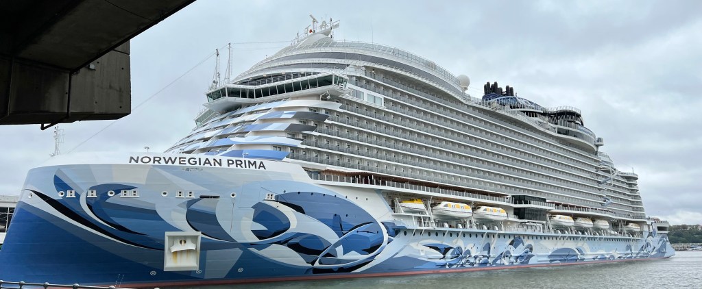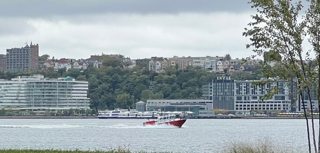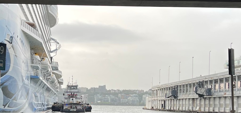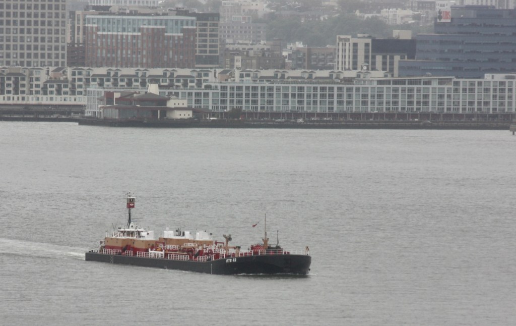 Wednesday brought a long-awaited break in the weather, with rain stopping, temperatures warming, and winds abating, though the rain was back by the late afternoon. Commercial traffic was heavy, with activity pent up during the storms of the past few days seemingly unleashed. There was excitement at the cruise terminal as the newly launched Norwegian Prima made its first arrival in New York after being launched in Iceland earlier this summer. Prima will run Caribbean cruises from here for the next few weeks. Disney’s Magic was also back in town, loading up for another cruise down to Bermuda.