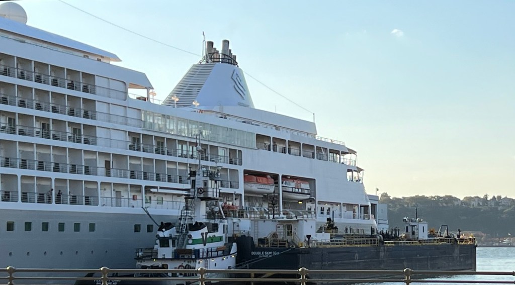 Disney Magic was back in town Monday, seen here heading back out for a run up to Nova Scotia with help from Moran TowingSilver Whisper arrived from Quebec City via Nova Scotia, Bar Harbor and Newport RI.Vendors waited at a security checkpoint before servicing the shipVane Brothers Fells Point provided bunkering serviceVane Brothers Fort Schuyler returned Monday from a delivery of probably heating oil to a depot in PoughkeepsieAnother Vane Brothers boat, the Charleston, brought a cargo north on TuesdayMiss Madeline, a Haugland Group tug not seen before, pushed hoppers north, probably heading for the company’s Tomkins Cove facility