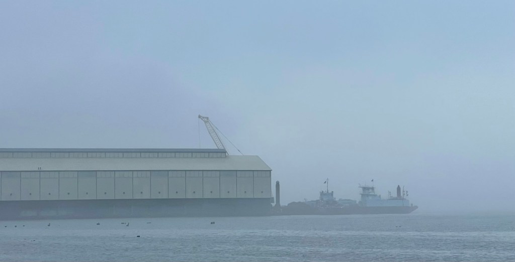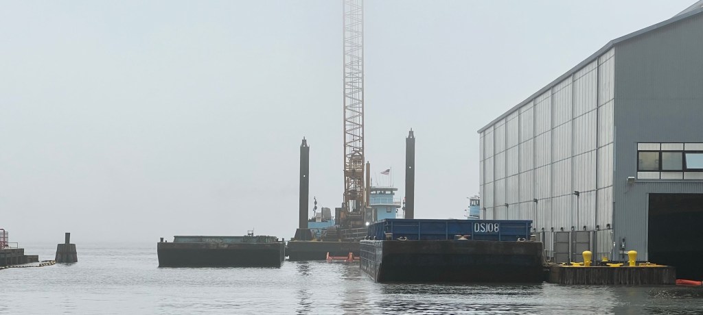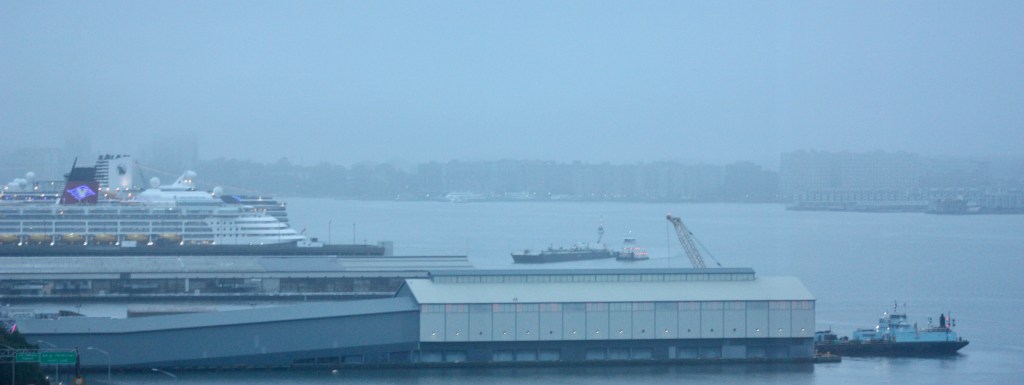 The thick layer of haze that sat over New York from Sunday through Tuesday was finally burning off Wednesday afternoon. Temperatures were unseasonably warm, but with the sun setting before 6pm now for the rest of the winter, opportunities for photography are somewhat reduced. Tanker traffic remains heavy on the River, and the DonJon dredgers were back, this time working by the DSNY Pier 99 facility. Meanwhile, the crane that had been working at Pier 96 appears to have finished its business and made an early Wednesday departure. The Disney Magic was back at Pier 90, and Holland-American’s Rotterdam, its first time here in a while. Usually the H-A boats dock in Brooklyn, but Rotterdam was on a transit cruise, arriving in NYC from Europe on its way to take up its winter duties in the Caribbean.