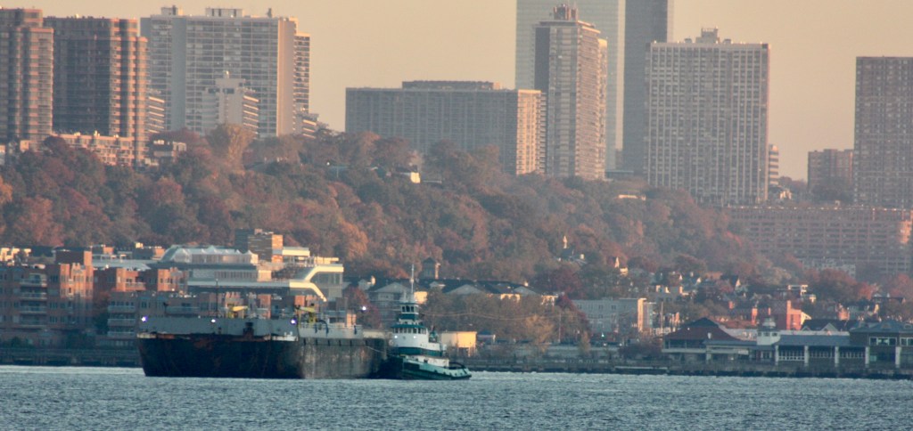 The glorious days continue, with early Friday fog lifting by midday and giving way to conditions that felt more like spring than autumn. The anchorages have been busy, with Patrice McCalister and a Poling-Cutler tug at rest Thursday with empty barges on the hip, and Saint Emilion and Evelyn Cutler in residence on Friday. Saint Emilion returned to the North River after visiting the Caddell boatyard earlier in the week and does not seemed to have resumed work after getting back in the water from its period on the blocks.