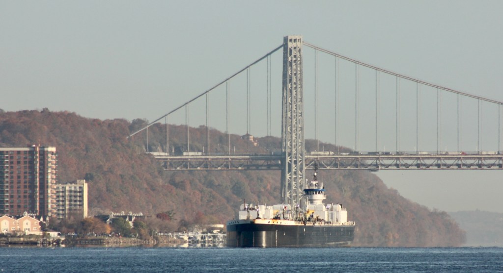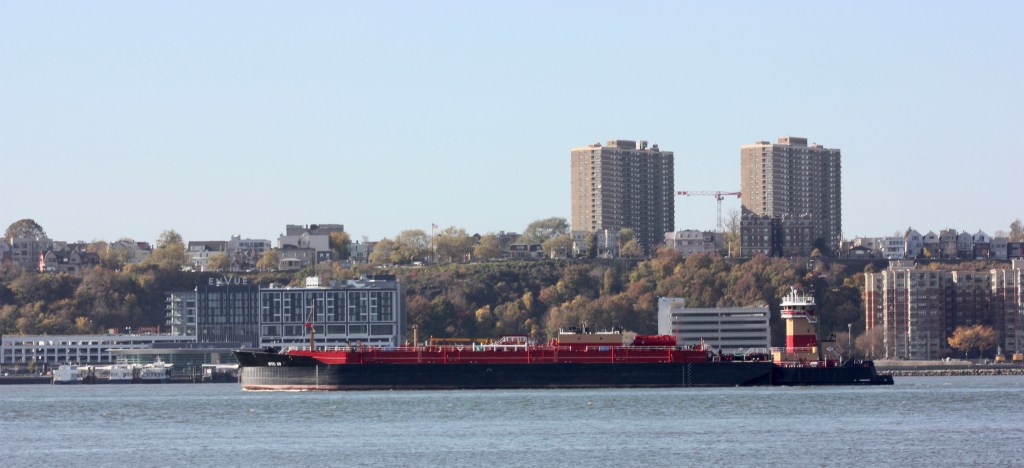 Meanwhile, observed commercial traffic was dominated by Reinauer ATBs. The Josephine came through early with a cargo for Albany. Kristy Ann was coming the other direction with a light barge while Nicole Reinauer returned from Boston light as well, briefly anchored in the River and then headed for the Reinauer dock on the North Shore of Staten Island. Meanwhile, Kirby’s Lincoln Sea with its plus-sized barge remained anchored off 96th Street.