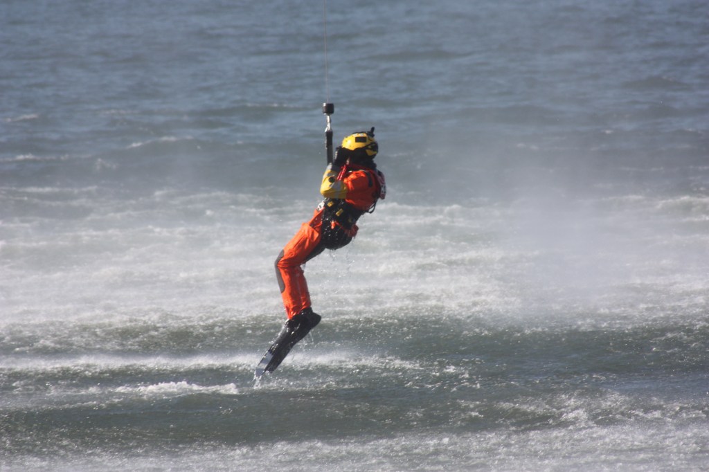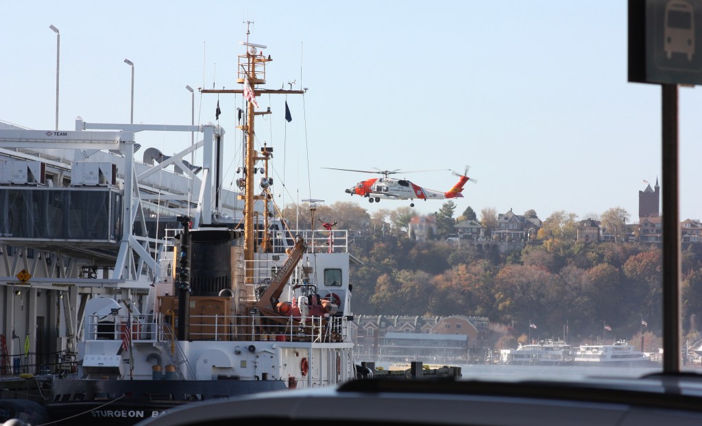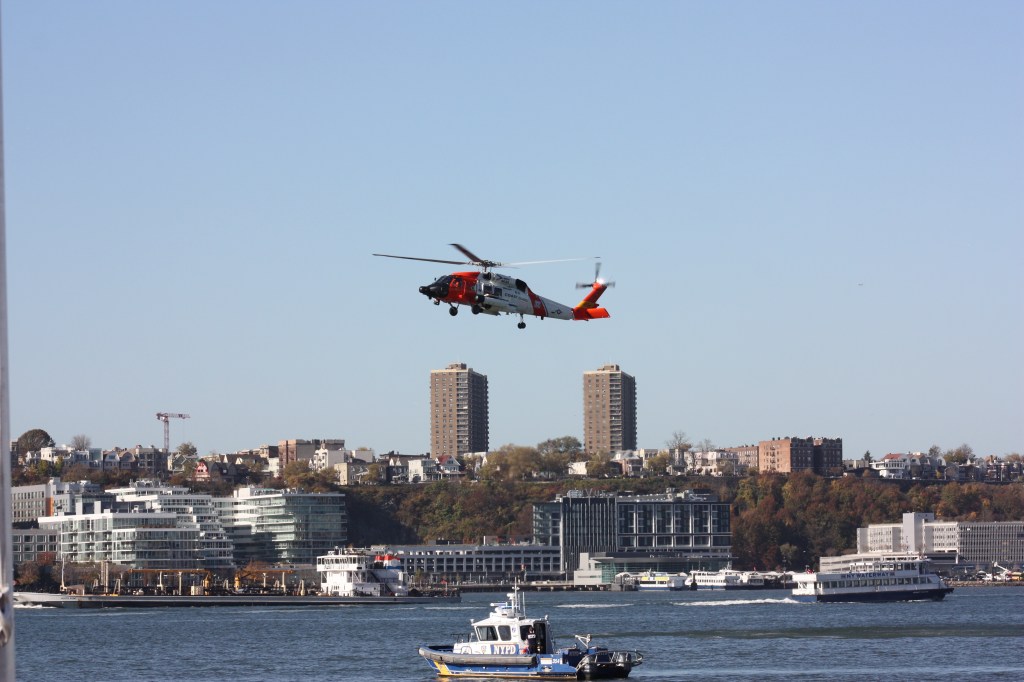 The Coast Guard demonstrated the service’s search and rescue capabilities on Pier 86 Thursday, ahead of Friday’s Veterans Day parade at which the Coast Guard will be the “featured service.” The Coast Guard brought in a Jayhawk MH60 helicopter, the Coast Guard version of the Blackhawk, and dropped a rescue swimmer in the water who was then winched up.