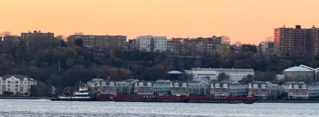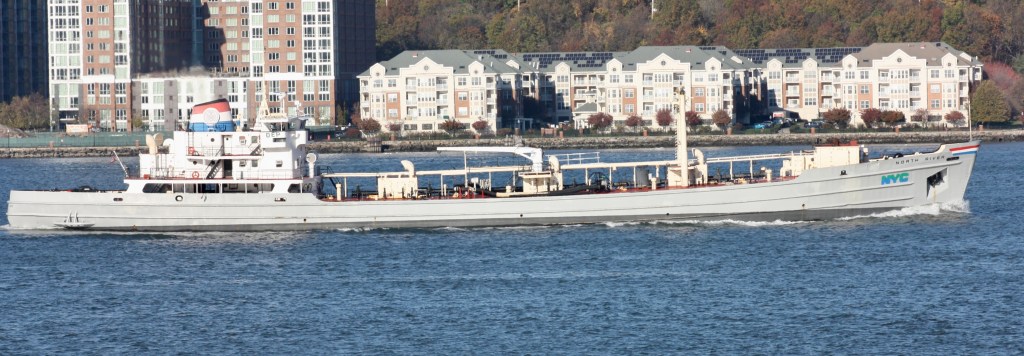 Another harbinger of winter was the arrival of a tanker barge at Pier 98, the fuel dock for Con Ed’s 59th Street Steam Plant. The plant mainly burns natural gas brought in by pipe, but number 4 fuel oil is used as a backup during periods of tight natural gas supply and during preparations for the winter season. Fuel is brought to the plant by barge and stored on the barge during the winter (see my June article in the West Sid Rag, or a more recent article in the Villager not by me for more). The barge itself, GCS230, belongs to Gellaty and Criscione Services and, according to an article by Andrew Gustafson published by Waterfront Alliance a few years ago, it is the last remaining operating vessel afloat built in the Brooklyn Navy Yard.