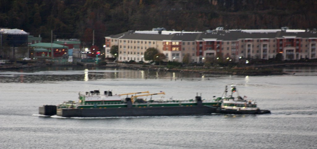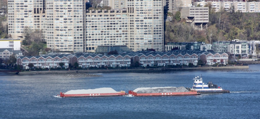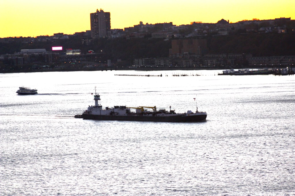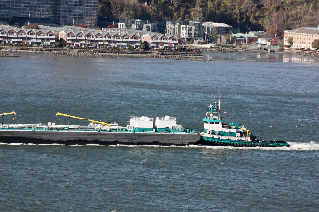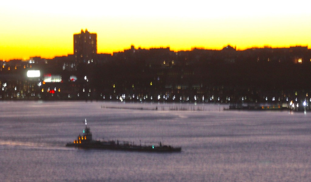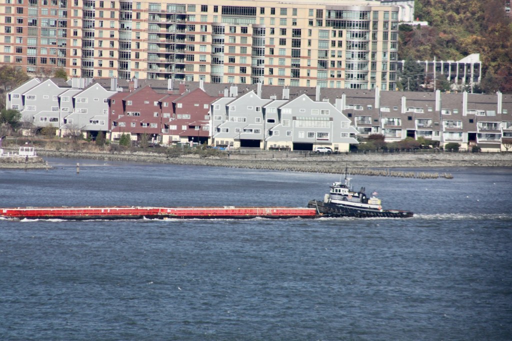 Clear and cold again Sunday, with temperatures just above freezing and stiff winds gusting over 20 knots out of the west. A small craft advisory was in effect for New York Harbor. Wind was visible on the River but conditions did not look choppy, at least not from shore. Chop seems to be worse on the River when winds are from the southwest or northeast and run counter to the tide. Commercial traffic was fairly typical and most of the ATBs at anchor Sunday had gone back to work with the exception of Gracie Reinauer who remained off Edgewater.
