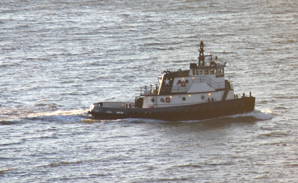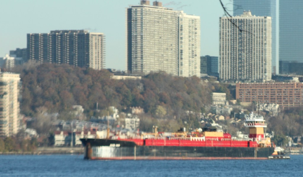 Temperatures climbed a bit Monday, reaching 40 by midday after starting out below freezing. Winds remained elevated, with a small craft advisory in effect again for the harbor, and shifted to the southwest, putting a bit more visible chop on the River. Tugs continue to shelter in the North River with their tanker barges during their downtime. Gracie Reinauer left her spot near Grant’s Tomb and headed to the Erie Basin barge port, but Kirby’s Cape Lookout and Vane’s Pocomoke arrived.