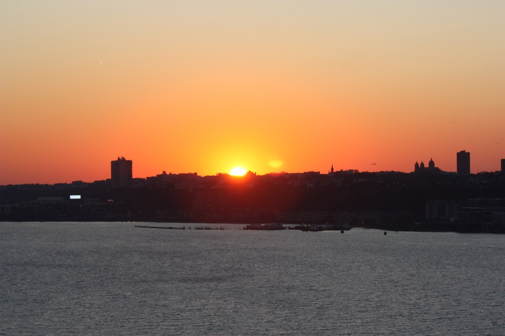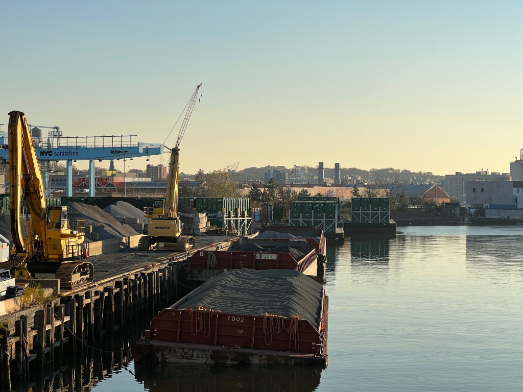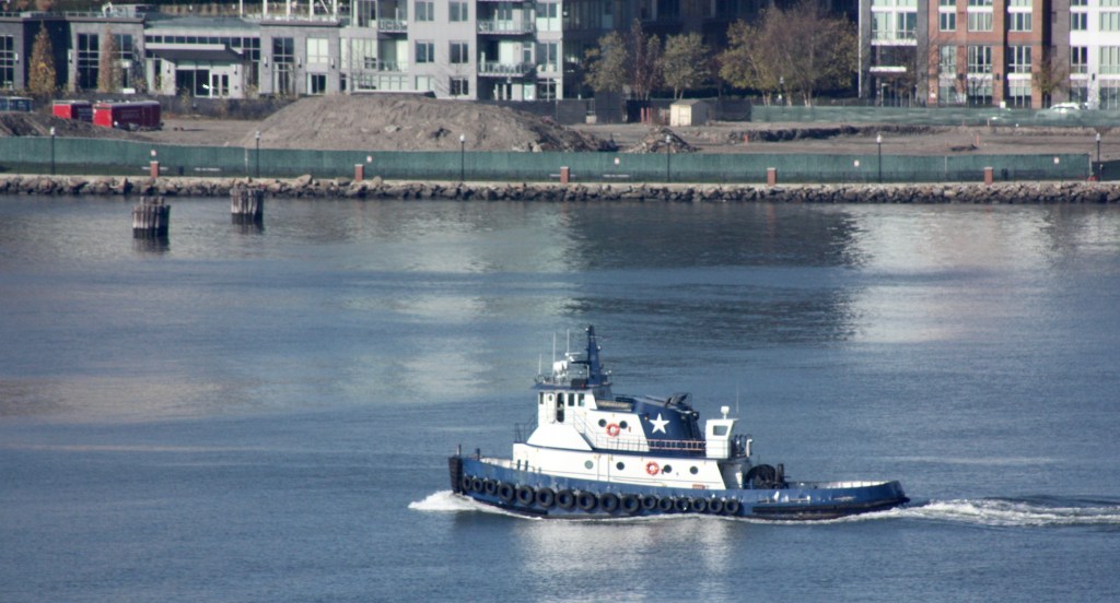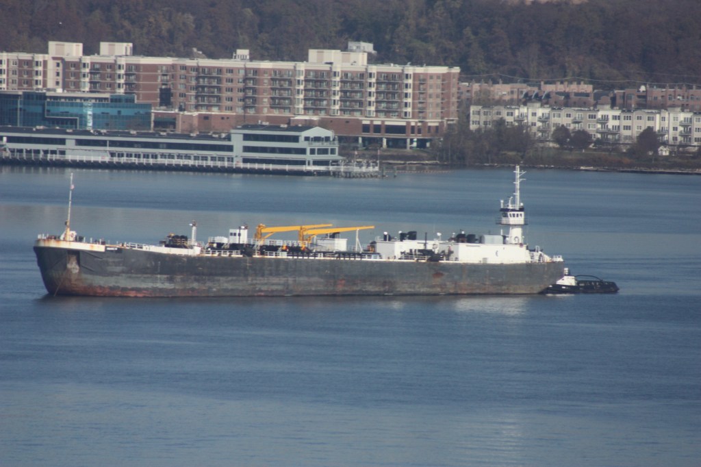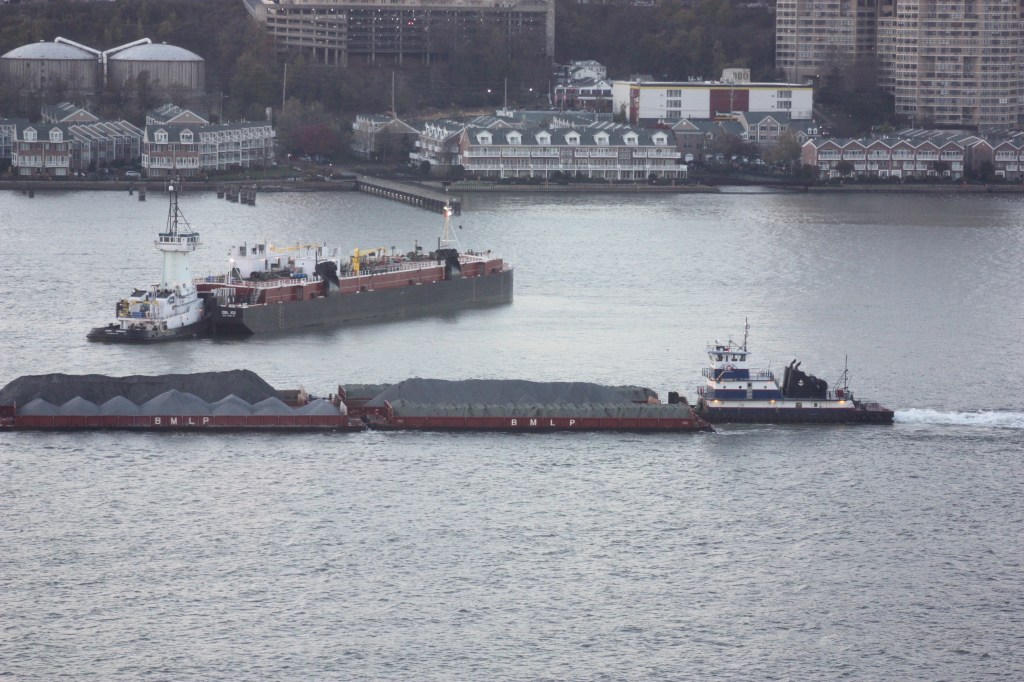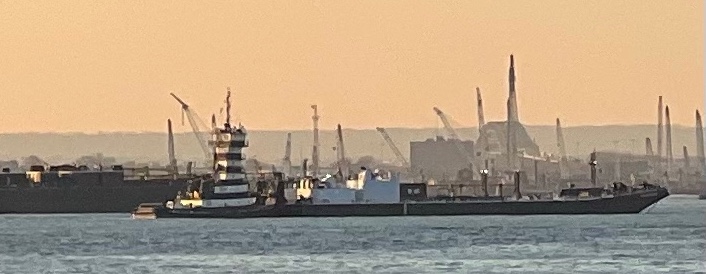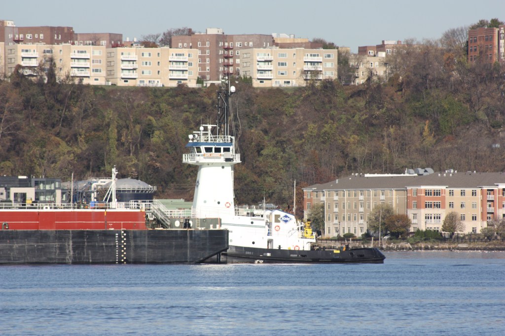 Kirby’s Cape Lookout remained anchored off 72nd Street for a 3rd dayAnd was passed by Buchanan12 at slack tide TuesdayAdeline Marie…And Kimberly Poling were anchored further northAdeline Marie and Kimberly Poling anchored further north on Wednesday Source: MarineTrafficDean Reinauer pushed a loaded barge north to Newburgh Wednesday morningFollowed by Dace Reinauer heading for Albany. Dace is the oldest tug we see regularly in the Reinauer fleet, built in 1968 but retrofitted with modern ATB connectors. Everly Mist brought stone down from the quarry in Catskill, NY, bringing the hoppers to the Bay Ridge anchorageNormandy made another visit to the sugar refinery in Yonkers, and then returnedEvelyn Cutler brought a light barge back from AlbanyOn the East River, the Crystal Cutler was bringing a barge back from the fuel terminal on Newtown Creek. We don’t see Crystal on the North River; presumably, her smaller size makes her well-suited to creek work, with the larger Cutler-Poling tugs handling North River jobs.CORRECTED: Down in the Upper Bay, the distinctive Chesapeake Coast (not Discovery as originally posted) was anchored Wednesday as wellIn the Gowanus Canal, NYC DOT brings in gravel for road work, and DSNY ships out waste in Waste Management containers to be transferred to trains (via truck) in Elizabeth. Trash is one commodity we do not see traveling on the North River—these containers ultimately move north by rail on CSX’s River Subdivision.Kayakers enjoyed a sunset cruise Tuesday, with full running lightsA 4:30pm sunset over the cliffs of Weehawken