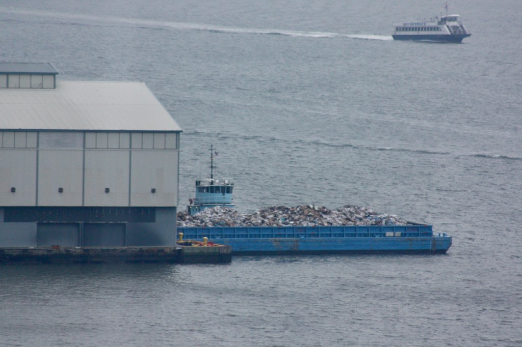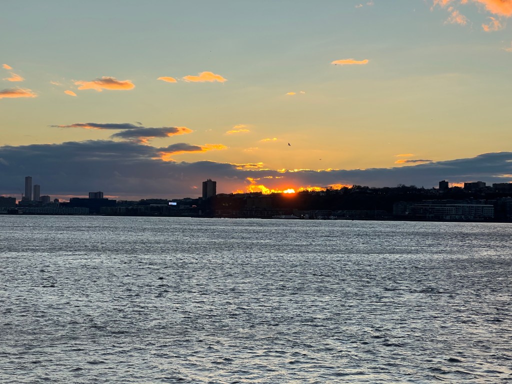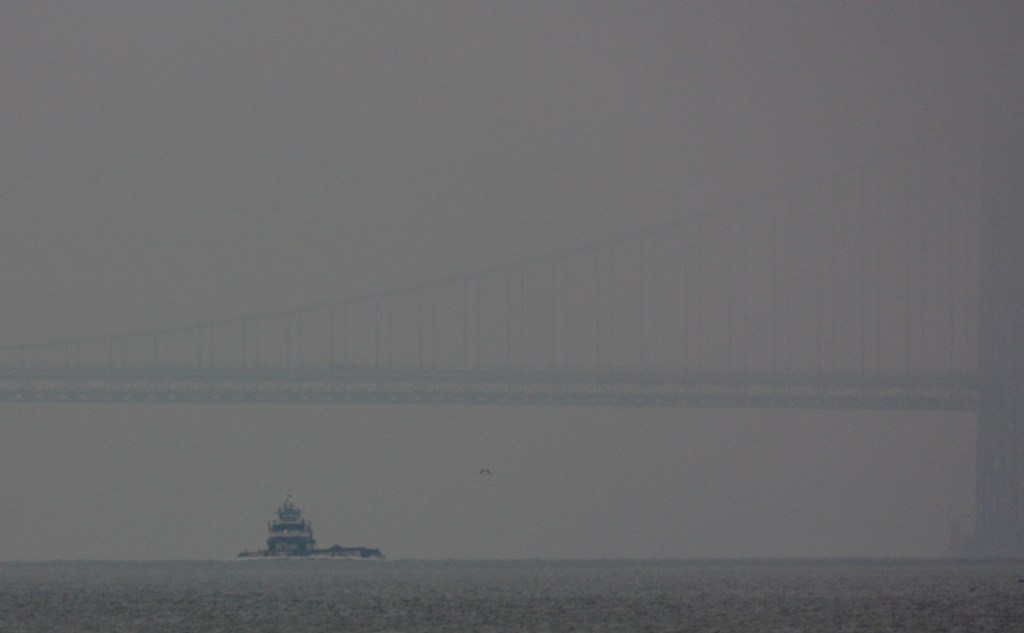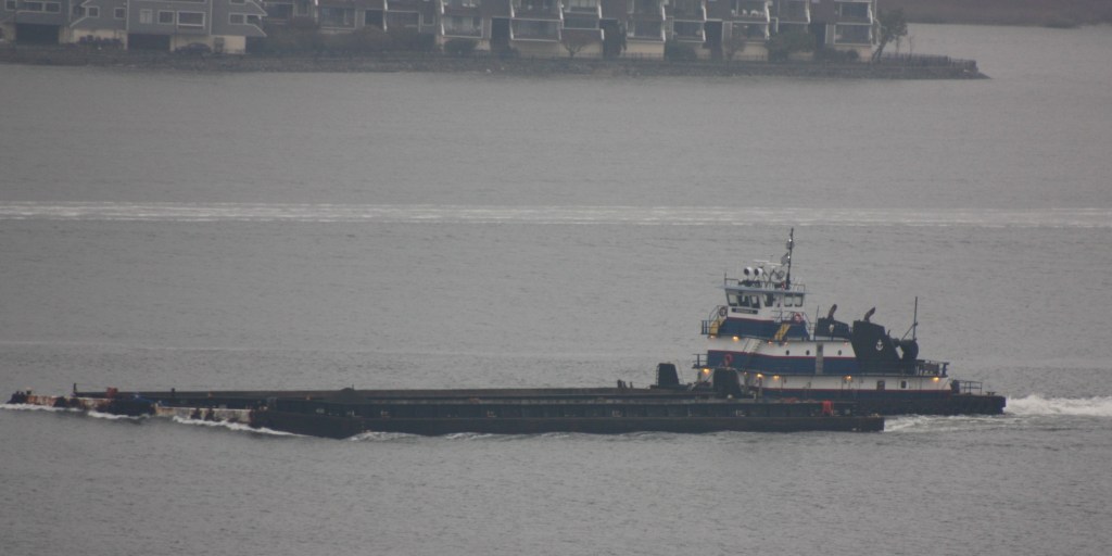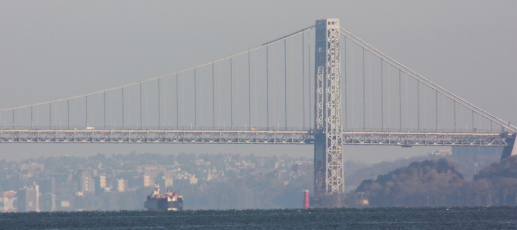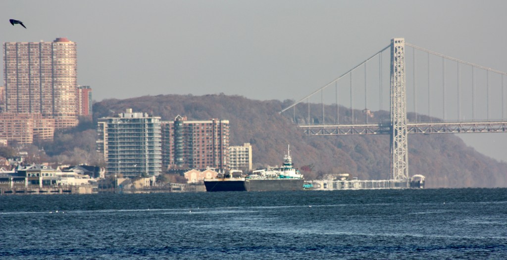 Cape Lookout, Adeline Marie, and Kimberly Poling at anchor Thanksgiving morningKimberly Poling heading for Raritan Bay Thanksgiving afternoonAdeline Marie left the River Friday morningBut soon came back after turning around in the Upper BayStephen Reinauer, one of the older tugs in the fleet retrofitted as an ATB, came south Thanksgiving morning with a light bargeAnd headed for the Erie Basin barge port where they remained through Friday morningHarbor Charlie was on patrol Thanksgiving morning in a 35’ boatCopper Mountain headed for Yonkers anchorage light Friday morning, passing Adeline Marie as she got underway.Later, Saint Emilion came down from Yonkers anchorage, also light, and it seems likely Copper Mountain took over her barge up there. Saint Emilion was heading up Long Island Sound by Friday evening.Buchanan 12 emerged from the mist by the Bridge Friday morningWith a smaller float of barges than usual after the holidayGenesis Vigilant had an Albany bound cargo Friday morningPinuccia was coming back from Albany with a light barge shortly afterReinauer Twins was heading for Albany with their 413’ barge loadedReinauer’s Kristy Ann was anchored south of the Bridge after returning from a delivery in Bridgeport, sitting a bit north of Adeline Marie as the final glow from the setting sun reflected off the hills of YonkersThe DSNY and their DonJon contractors were back at work Friday, shipping paper waste to Staten Island for recycling.A herring gull sat on the wreckage of old New York Central railroad piers on Thursday.The sun disappeared behind Weehawken at 4:22pm EST Friday