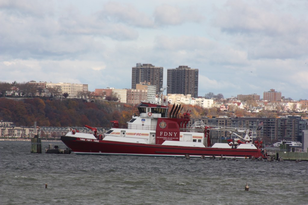 The retired fireboat at Pier 25 has no visible identificationBut a close look at the stern reveals the name Governor Alfred E. SmithThe Smith was last based at the historic Pier A near the Battery. Pier A is one of the few structures to bear the name “North River”, along with the North River Water Treatment Plant, and, more recently, the North River Lobster Company dinner boat The DiscoveryThe John J. Harvey remains tied up at her usual Pier 66 base with the retired light ship Frying Pan on Monday. See Back to the 60s on this blog for photos of Harvey in actionThe John McKean tied up in Haverstraw in early NovemberThe FDNY’s active Three Forty Three boat at the Marine 1 base in ChelseaThe other large 140’ FDNY fireboat, Firefighter 2, was at their usual base at the old Homeport pier in Staten Island on Monday, prepared to respond to emergencies on the Upper and Lower Bay.