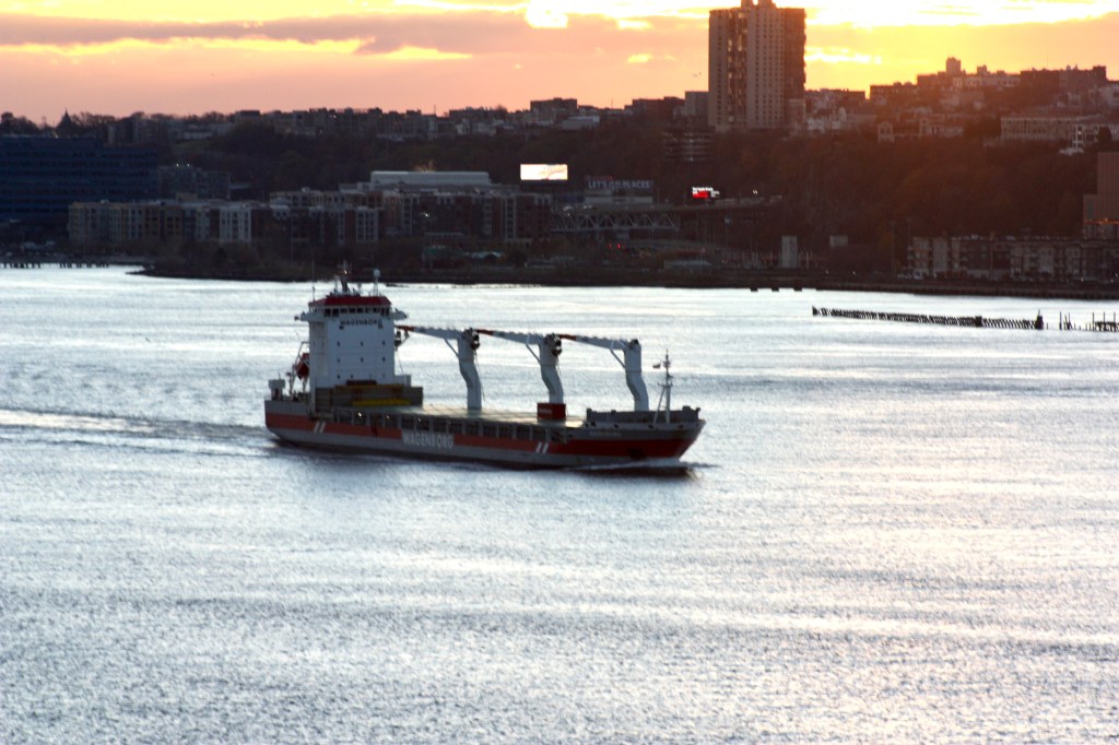 Dawn on Monday brought a glorious rainbow to the River, arching from Weehawken up to North Bergen. A last line of rain showers came through at 7:20am, ending the effect, but it was great while it lasted. Activity on the River remained heavy. Adeline Marie remained at anchor on the River as she has been since Thanksgiving Eve. She was joined by Dean Reinauer, dropping their hook off 86th Street after returning from Newburgh, and Kimberly Poling, off 96th Street on return from Albany. Kristy Ann departed her spot by Grants Tomb and headed for the Upper Bay. Pocomoke had also departed early Monday, heading for Philly with her loaded barge—a relatively rare example of refined products heading south. Just before sunset, the Royal Wagenborg Arubaborg came through, heading to Albany from Finland and very likely carrying wood pulp for paper mills up north.