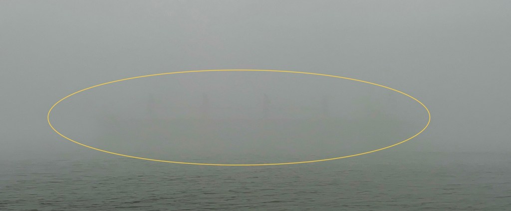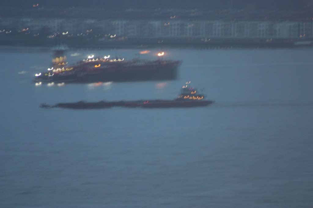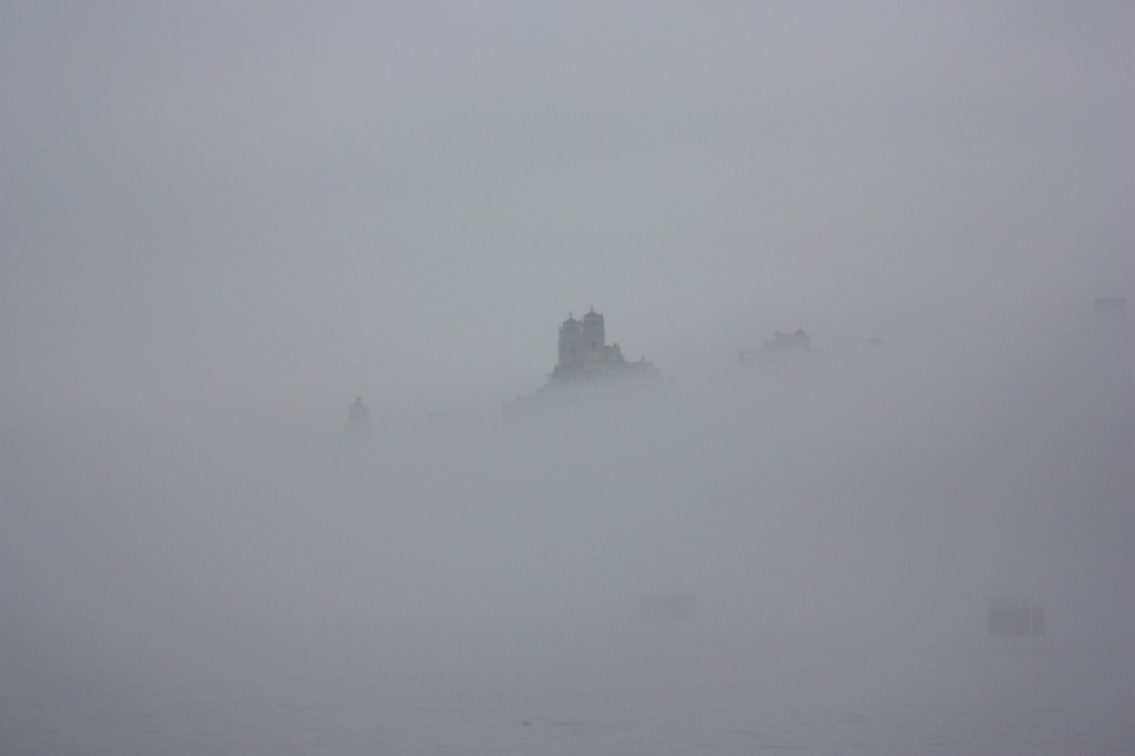 A blanket of thick fog sat over the river for almost the whole of Wednesday, with visibility ranging from poor to worse than poor. At sunrise it was practically pea soup, such that a bulk freighter coming down from Coeymans was nearly completely invisible at less than 500 yards off the end of pier i even as periodic blasts on its horn announced its position. By the end of the day, the fog was lifting and traffic was moving through fully visible.