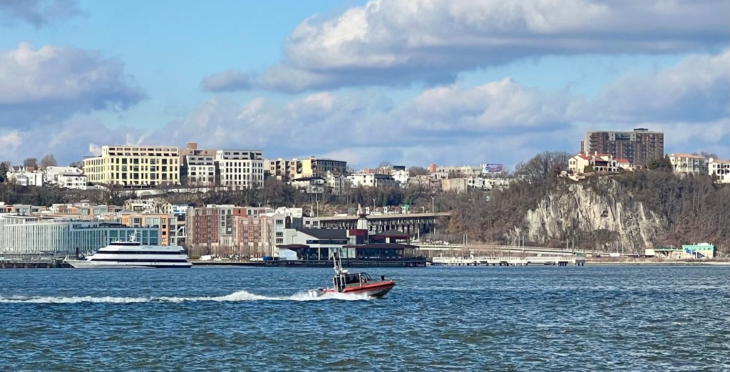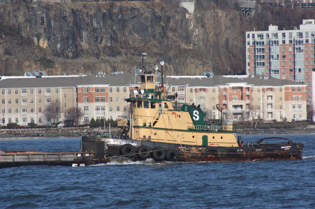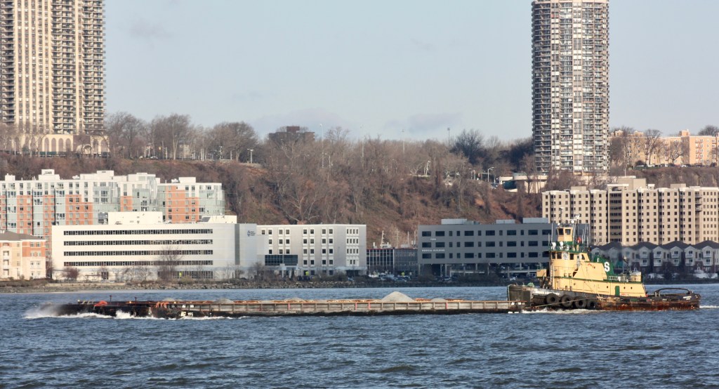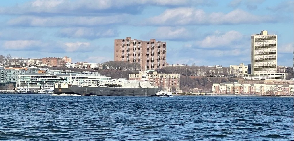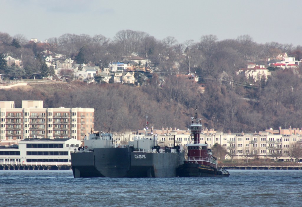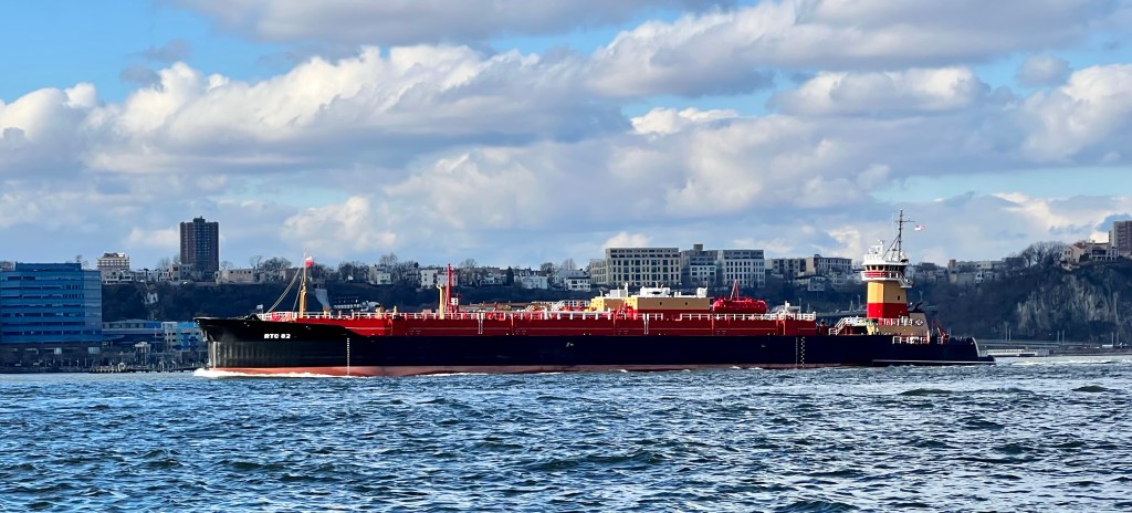 The rain cleared Saturday and temperatures climbed into the 40s with winds around 15 knots. HRCS had its J24s on the water, and a group of kayakers was also seen in the midday sun. Patrice McCalister anchored off 96th Street in the rain on Friday, and remained Saturday morning with her barge on the hip, her usual configuration when the barge is unloaded. Saint Emilion returned from Albany Friday night and appeared to have handed off its barge to Copper Mountain, which came up from Caddell’s dry dock and anchored with the barge about half a mile north of Patrice, remaining there Saturday. Tanker barge traffic Saturday was heavy, but was mainly empties moving south, while some stone hoppers were also seen heading south.
