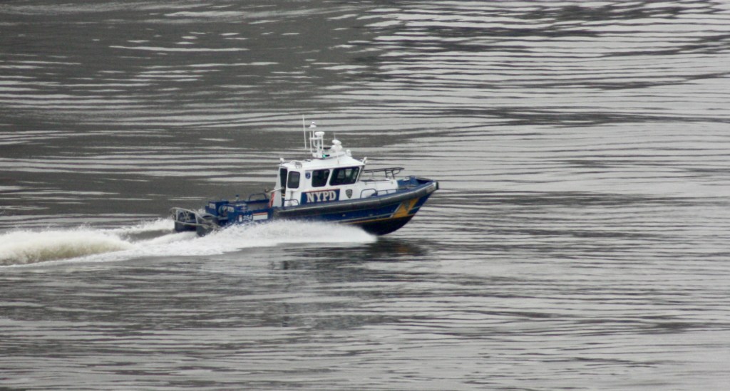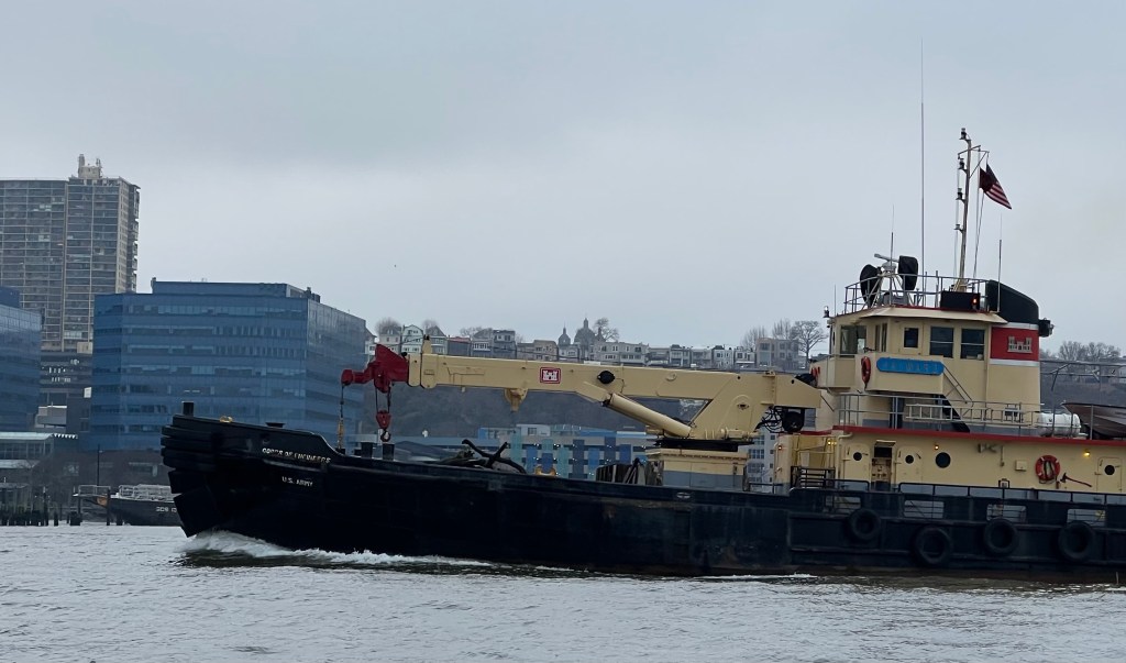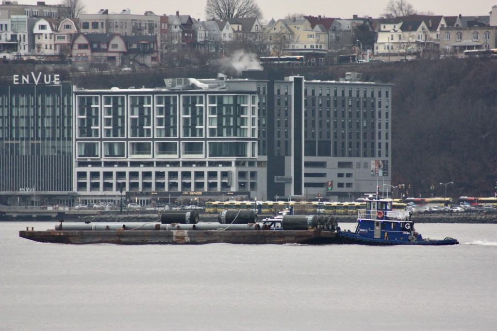 The Corp of Engineers boat Hayward fished a large tree limb or tree trunk out of the River as Dann Marine’s Treasure Coast pushed an empty cement barge north, heading for the Lafarge plant in Ravenna NY.The Hayward had to make several trips to collect all the hazards, with a pile of lumber visible on the deck in this photo.Another Corps boat, the Moritz, also made a loop up the River.The diminutive Kenny G and another Sound Marine work boat brought a deck barge with what looked like parts for marina pilings (note Marine Guard stenciled on the black cylinders). They were coming from the Sound Marine base at the North River boat yard in Nyack and heading for Red Hook.The Rockaway DEP tanker, one of the newest generation vessels in the fleet, was working the North River plant Thursday, ferrying sludge to Wards Island for dewatering.An NYPD 35’ boat was patrolling the River