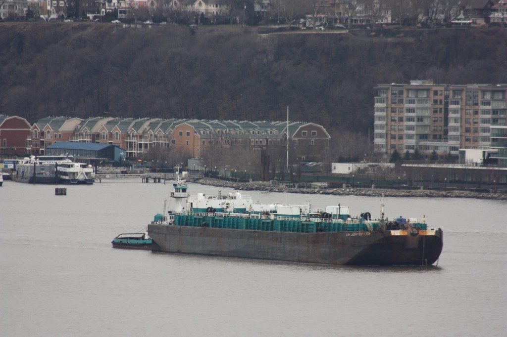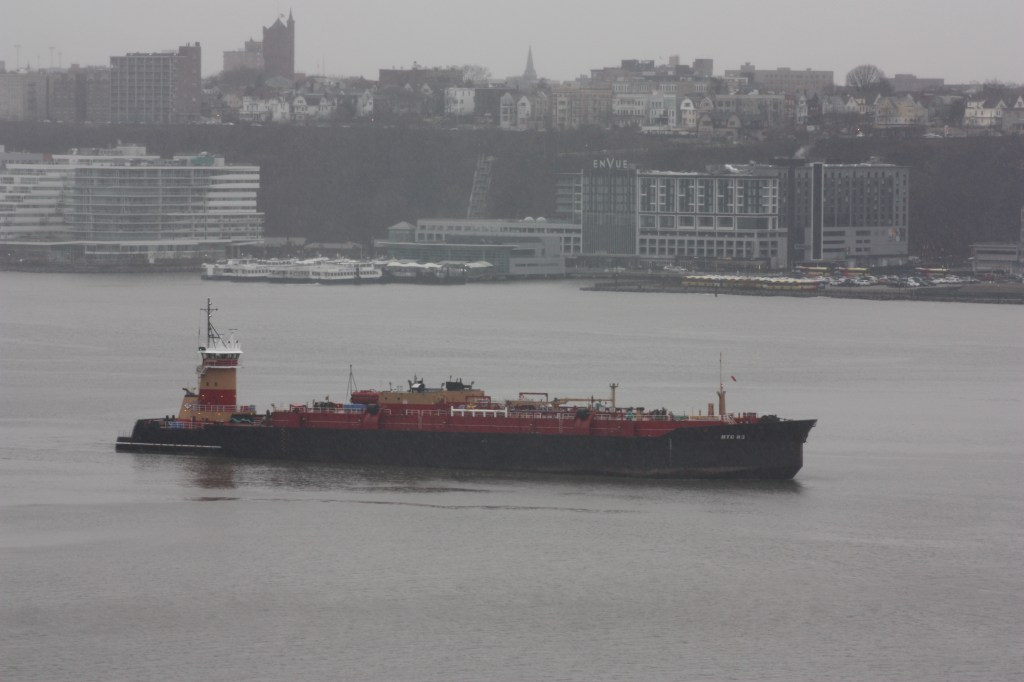 Wednesday brought precipitation and even some snow flurries, but we remain without significant accumulation of snow this winter, rapidly closing in on a record. Winds remained brisk, and gale warnings went into effect for the Harbor Wednesday afternoon. Deteriorating conditions saw Norwegian Gem postpone her scheduled 4pm departure from Pier 88 until 3am Thursday, according to Cruisehive. Tanker traffic was heavy on the River for the first time in a while.