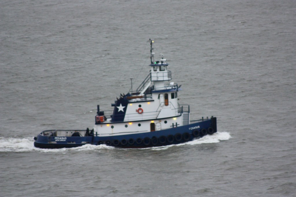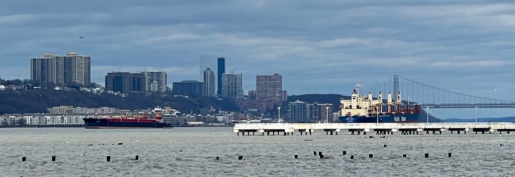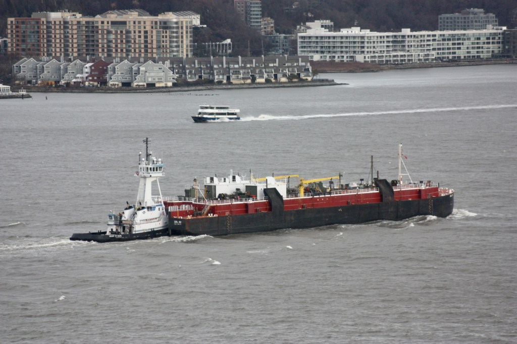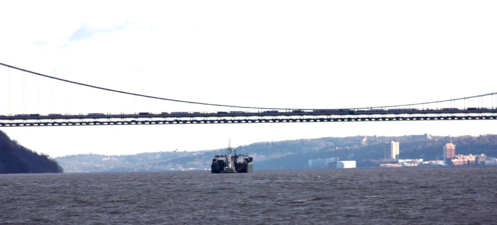 Josephine was anchored off 72nd Street overnight after returning from New Haven, but then left mid-morning for the Reinauer dock on the Kill van KullGenesis Glory was also anchored south of the bridge overnight after arriving Wednesday afternoonThe Haggerty Girls arrived from Boston Thursday morning and anchored off 110th StreetTimothy L. Reinauer returned from New Haven and anchored off 72nd Street, replacing Josephine. Timothy was launched in 1979, though her tower and raised wheelhouse are of more recent vintage and she was retrofitted with ATB fittings in 2009 according to tugboatinformation.comB. Franklin Reinauer anchored between the Haggerty Girls and Timothy after returning from Fall RiverMount St. Elias, a Kirby tug we have not seen on the River since October, brought a light barge back from New Haven and anchored north of the BridgeA 575 foot bulker headed north for Albany or Coeymans from Algeria after a stop in Wilmington…passing the anchored ATBsVane’s Elk River was running light, heading upriver, seen here passing Timothy Reinauer’s RTC 84 bargeMetropolitan Marine’s Pegasus was also running light, possibly heading for Yonkers to assist a sugar barge leaving the Domino pier as we have seen Pegasus and her fleet mate Normandy do in the pastDann’s Calusa Coast spent the evening with her loaded barge in sheltered waters off Yonkers but by Thursday afternoon she was heading for sea with her barge on the wire and signaling Baltimore, perhaps marking an end to her New York Harbor residence of the past month.