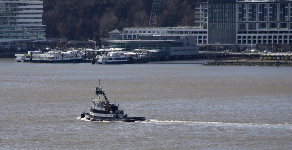 Temperatures plunged below freezing just before sunrise on Friday and fell below 20 F by sundown. Gale warnings were in effect for the harbor as the NOAA weather station at Robbins Reef lighthouse in the Upper Bay clocked gusts above 50 knots. With Upper Bay anchorages unappealing, a crowd of tanker barges took up residence on the North River. By Friday morning there were 4 Reinauer ATBs south of the Bridge. Timothy Reinauer left after sundown and headed for the Caddell dock on the Kill van Kull but was replaced by Kristy Ann who dropped anchor after sundown on her way back from Albany. Centerline’s Adeline Marie spent Thursday evening in the Upper Bay but by Friday afternoon headed for calmer waters, briefly stopping at 72nd Street and then joining Choptank north of the Bridge, with the latter having been there since Thursday with a loaded looking barge.