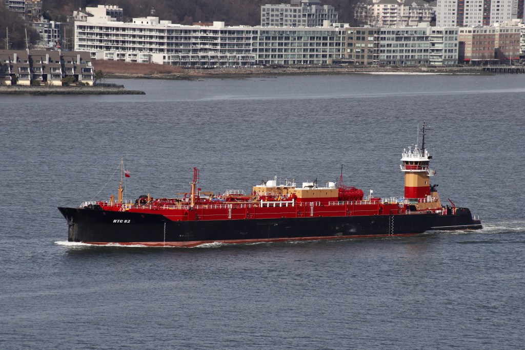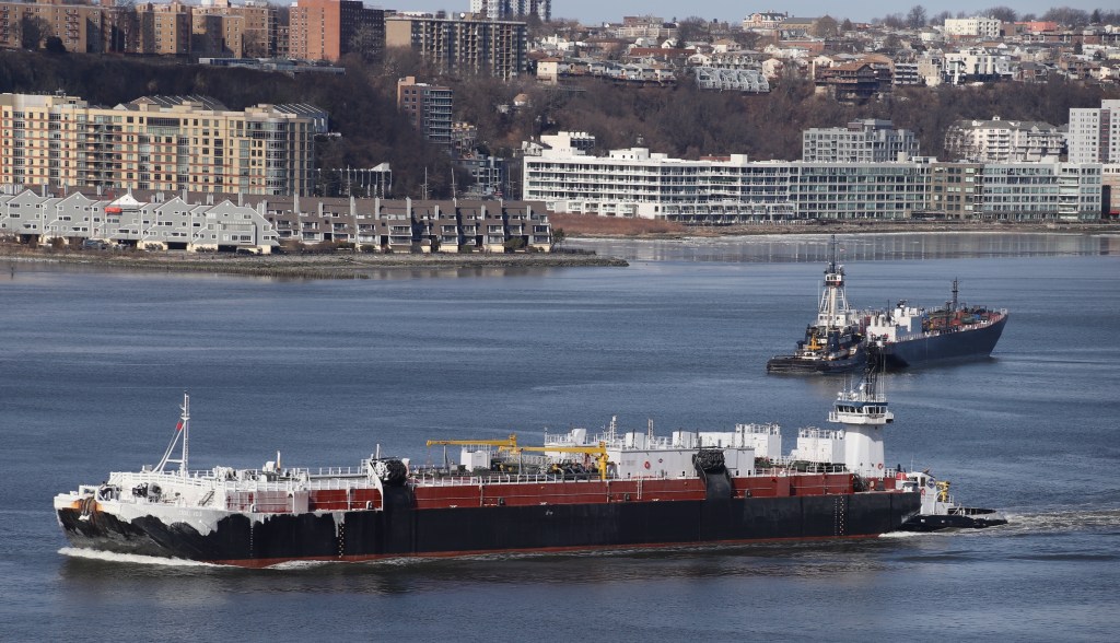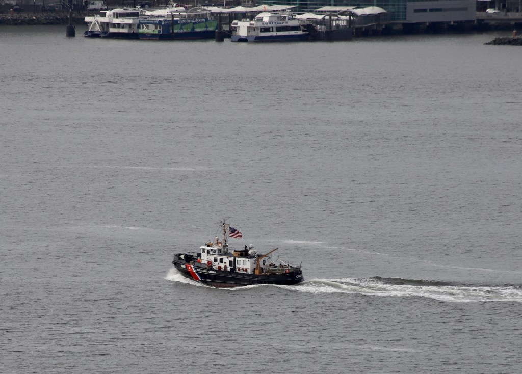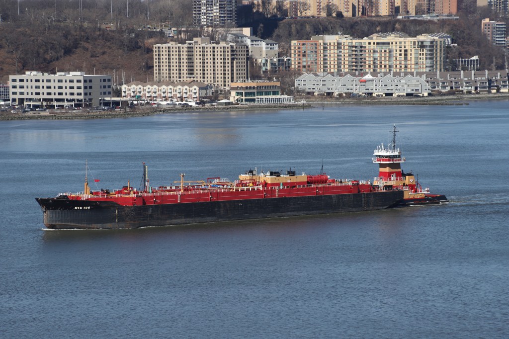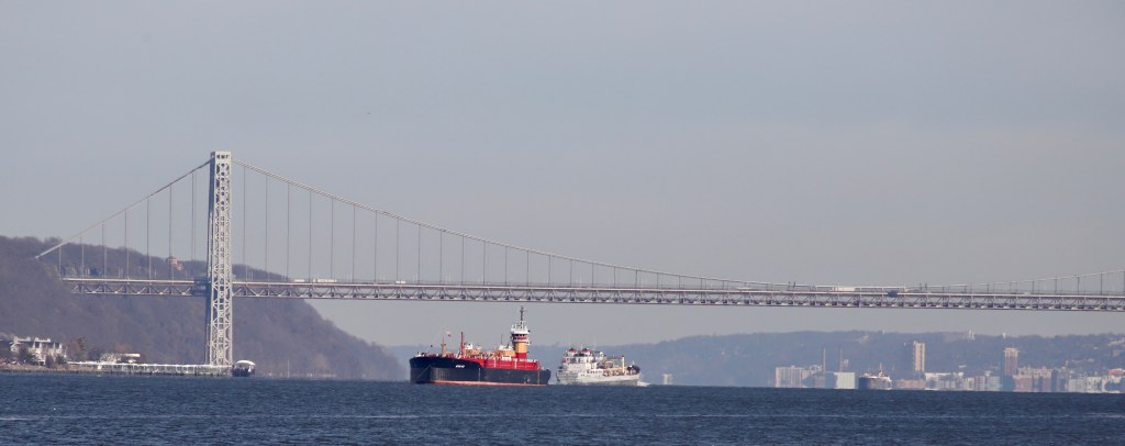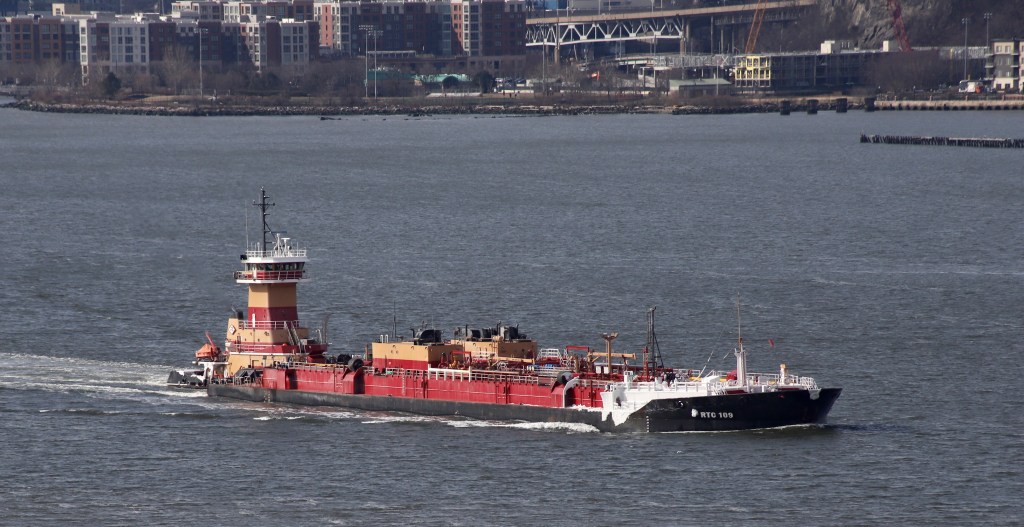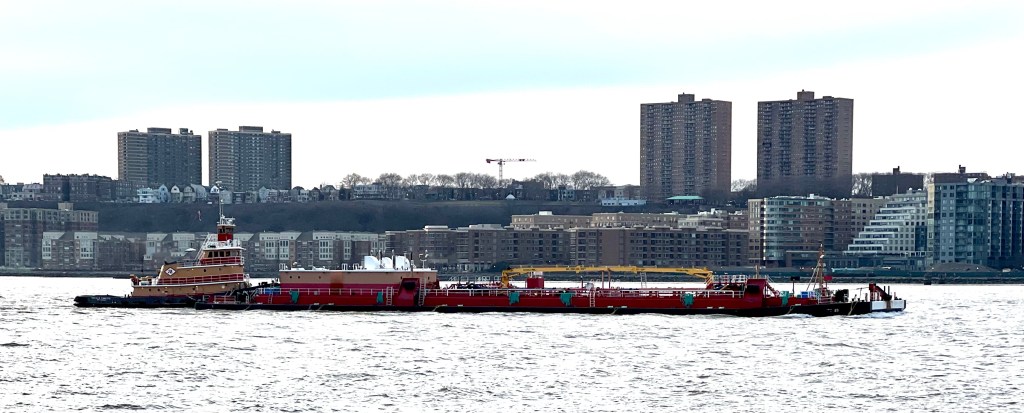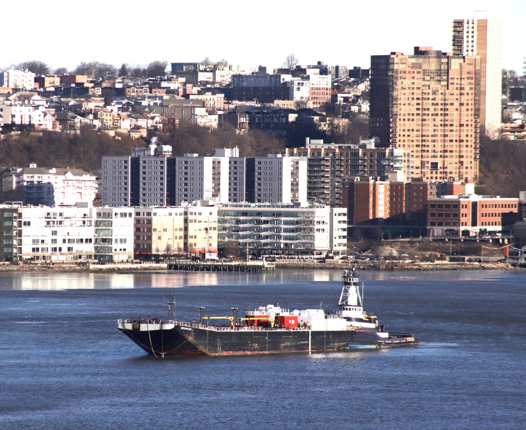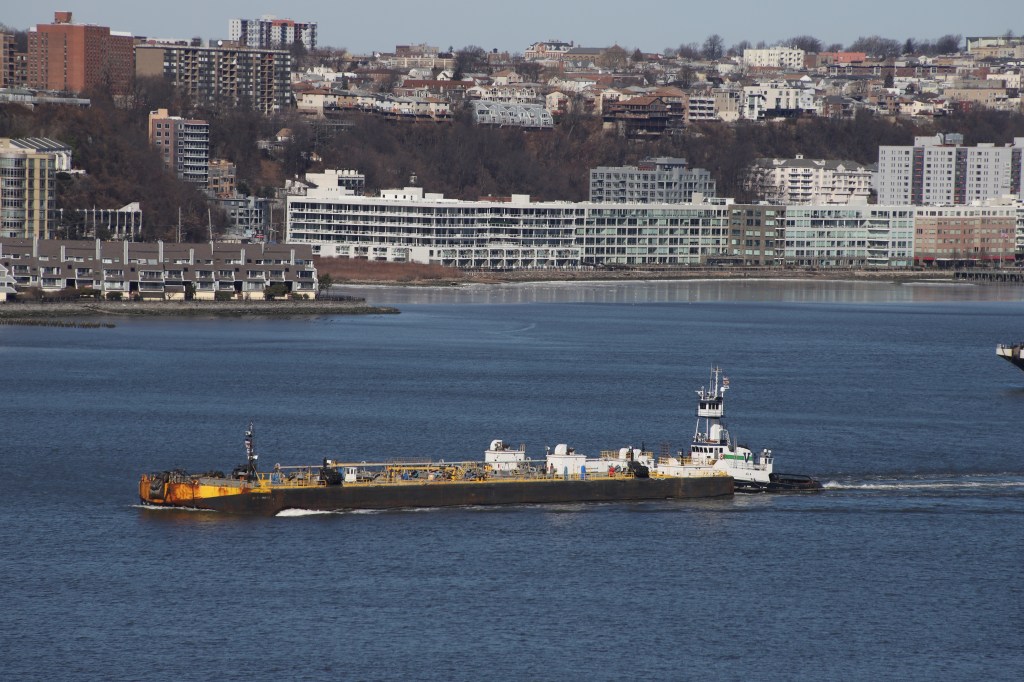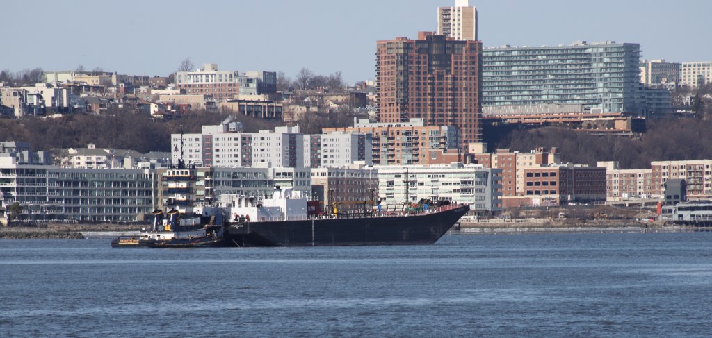 Sapphire Coast normally pushes cement barges back and forth to the Lafarge plant in Ravenna, but Friday night she brought a 300’ tank barge up to anchorage off 72nd Street from the harbor for safe keeping during the gale.Around midday, Sapphire handed her barge off to Chesapeake Coast, a pusher tug more commonly assigned to tanker barges which had road out the storm at pier on the Staten Island north shore.Chesapeake stayed put with the barge until sunrise Sunday when they headed for the Kill van Kull.Dean Reinauer pushed its 413’ barge down to the Reinauer dock in Port Richmond Saturday morning after riding out the storm on the North River.Followed closely by the nearly identical Dylan Cooper, passing the Sapphire Coast still in place behind its barge at that pointVane’s Elk River escaped the gale with its loaded barge, spending Thursday and Friday off Spuyten Duyvil, but on Saturday they headed for Cateret where they likely finally discharged a cargo which had originated at the refineries on the Delaware River south of Philadelphia.Kirby’s Cape Henry returned from Providence Saturday morning with a crust of ice on the bow of their barge, a frosting which boats anchored on the River avoided.Henry made a long loop up to Yonkers, but did not linger, instead heading to anchorage in the Harbor as conditions improved and the ice line receded from her bow.A pair of Reinauer ATBs at anchor Saturday morningBy Sunday morning, Curtis remained uptown, with the DEP’s Red Hook tanker seen in the background making a right turn into the North River sewage plant dock.Curtis left the River Sunday around midday pushing their 350’ bargeOnly Kristy Ann was anchored off 72nd Street by the end of the day SundayGracie Reinauer was heading for Newburgh Sunday with a cargo from Bayonne and an ice coating on the bow of her 400’ barge after spending the night at anchor on the Upper BayReinauer’s Matthew Tibbetts had a loaded barge bringing an oil products cargo to Poughkeepsie. Matthew is one the smallest tugs in the Reinauer fleet and one of the few without ATB couplings. Shallow draft at the Poughkeepsie pier may be the reason why Matthew does this run.Ice was accumulating on the shoreline Saturday but there have been no large flows on the River yet this year. The Coast Guard’s Sturgeon Bay icebreaker has been operating between Kingston and Albany, so perhaps we will see some soon. The smaller icebreaker, Line, was heading back to the Bayonne base though, after spending four days working from PoughkeepsieA Cape Cod-based Jayhawk came down from Falmouth Saturday along the south shore of Long Island, made two loops around Manhattan, then landed at Teterboro for a bit before flying back to base over the Sound.A 35’ NYPD launch patrolled on SundayA smaller NYPD boat was moving south later in the dayNew Jersey State Police’s Jersey City-based boat was also on patrolDonJon had a load of paper heading for recycling from Pier 99 SaturdayRecreational activity was out of the question for most of the weekend, but a kayaker got out Sunday as temperatures climbed above 40