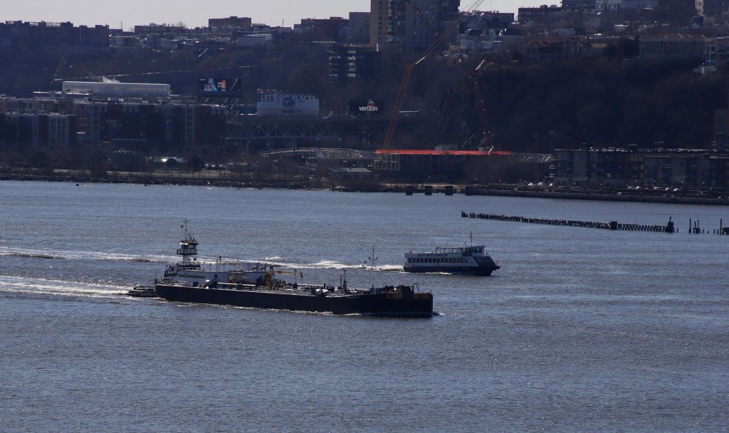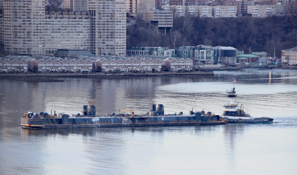 The weekend brought pleasant weather with temperatures in the 40s and occasional periods of gusty wind. River traffic seemed rather light. By the end of the weekend Vane’s Pokamoke and Gracie Reinauer were anchored off the Upper West Side.