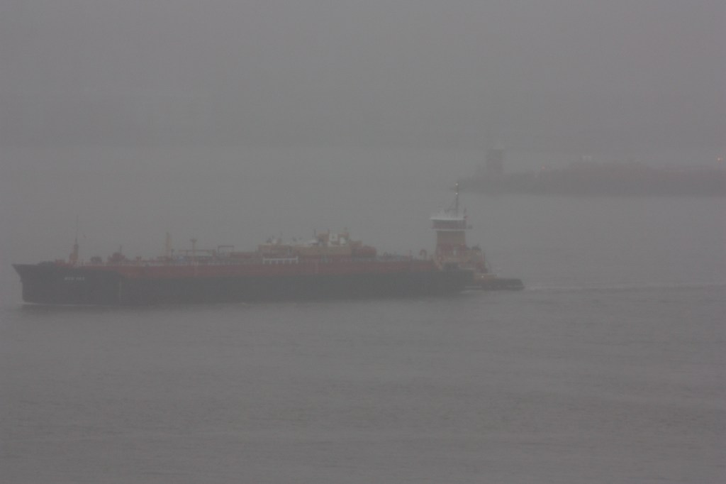 North River anchorages filled up Friday night as a weather system came through Saturday, generating a small craft warning for the Harbor and steady rain. Through traffic was fairly heavy, with product barges heading north, a sugar barge arriving for Yonkers, and a foreign-flagged tanker leaving town after a delivery in Albany.